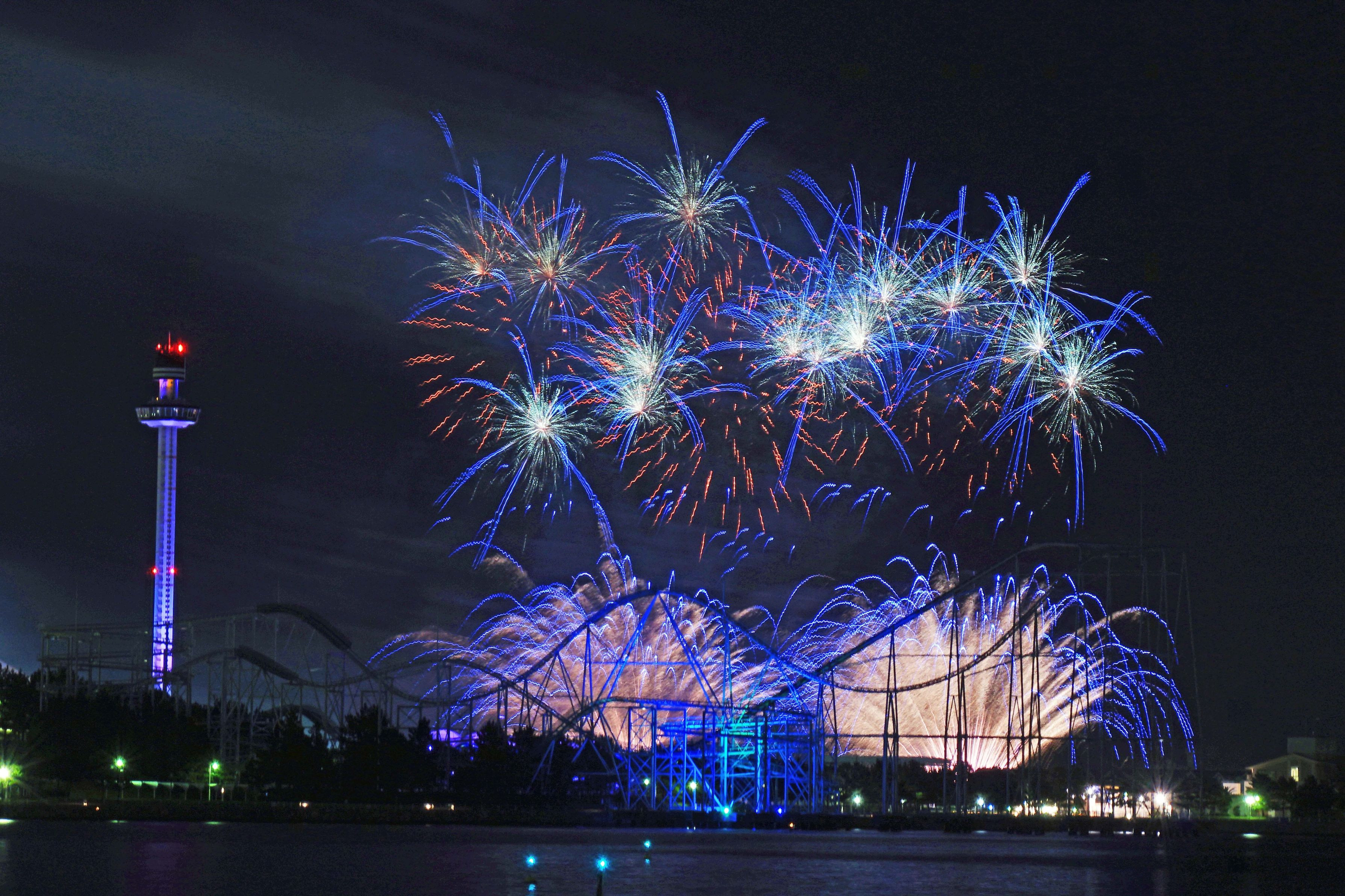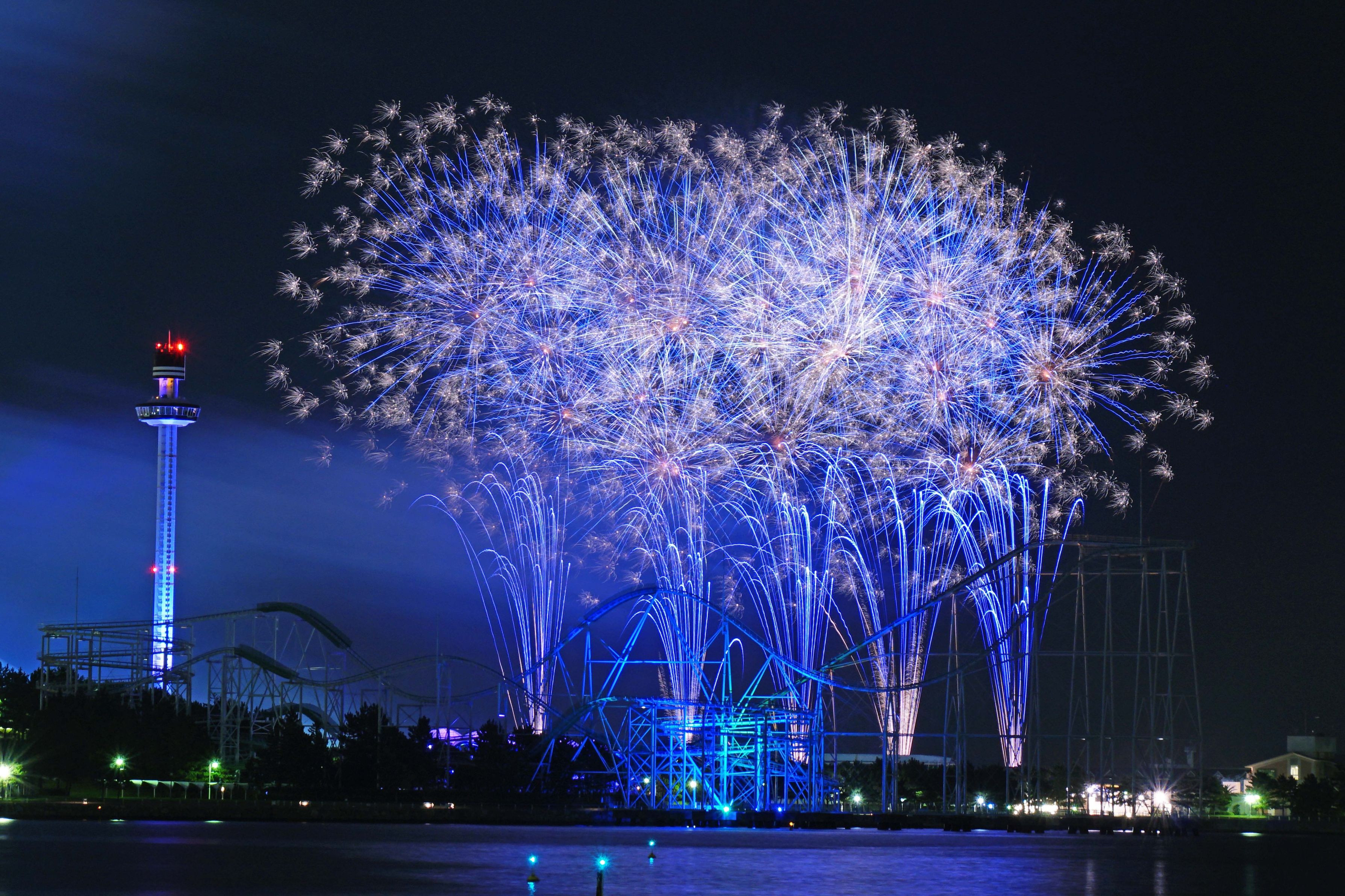雨があがり、久々の花火撮影。 OchameOchameさんと偶然お会いしました。 OchameOchameさんお疲れ様でした。 青い花火2点、集めてみました。全画素超解像ズームを使用しています。
