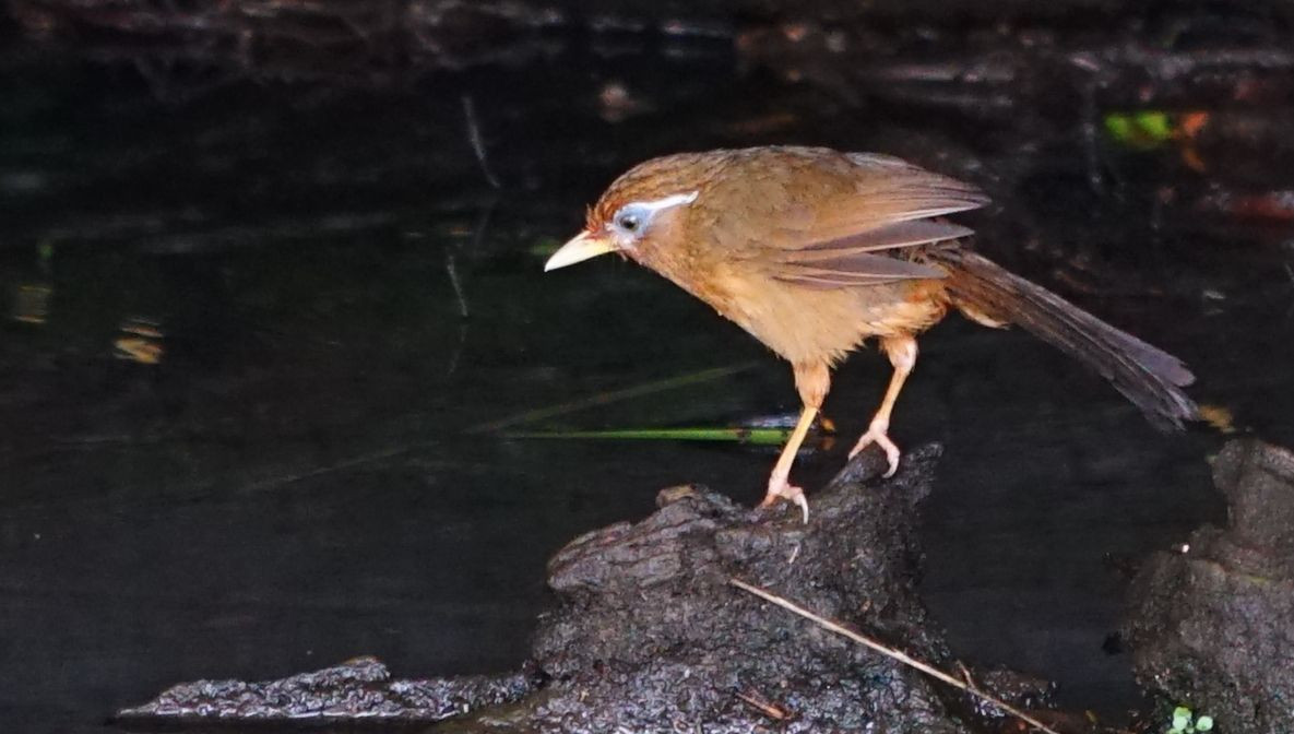 カワセミがやって来ず、モノマネ上手の我眉鳥が水浴びにやって来ました