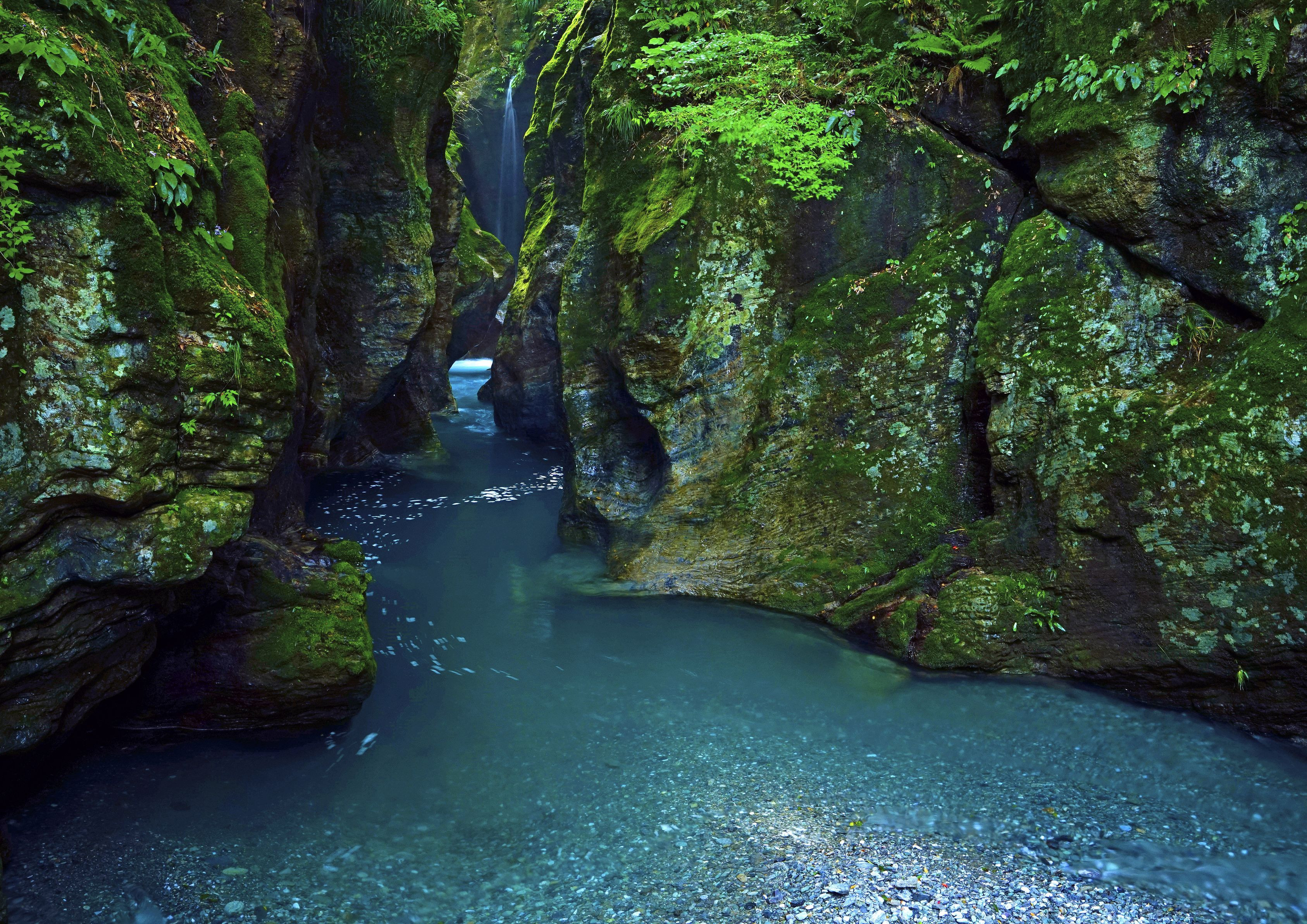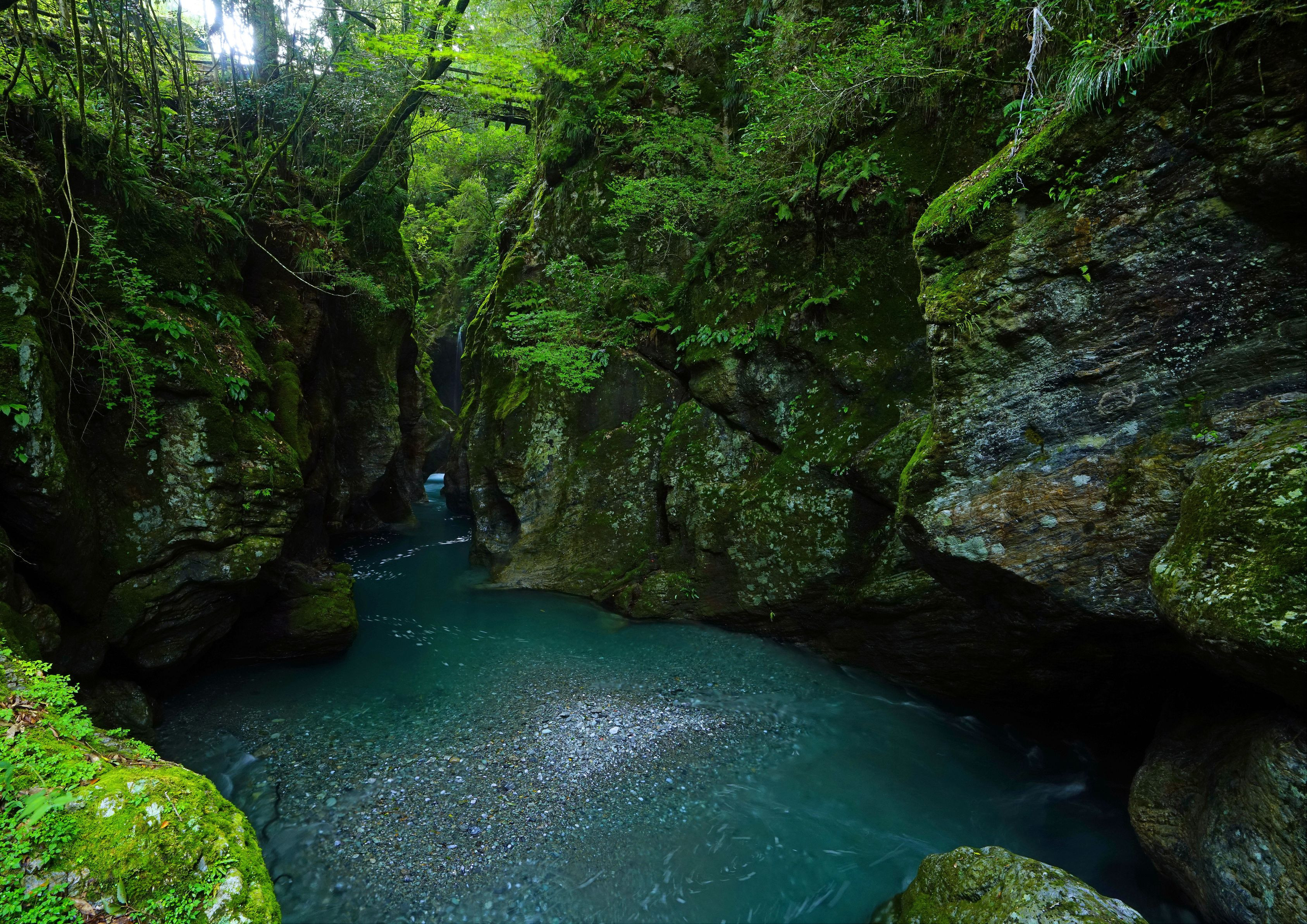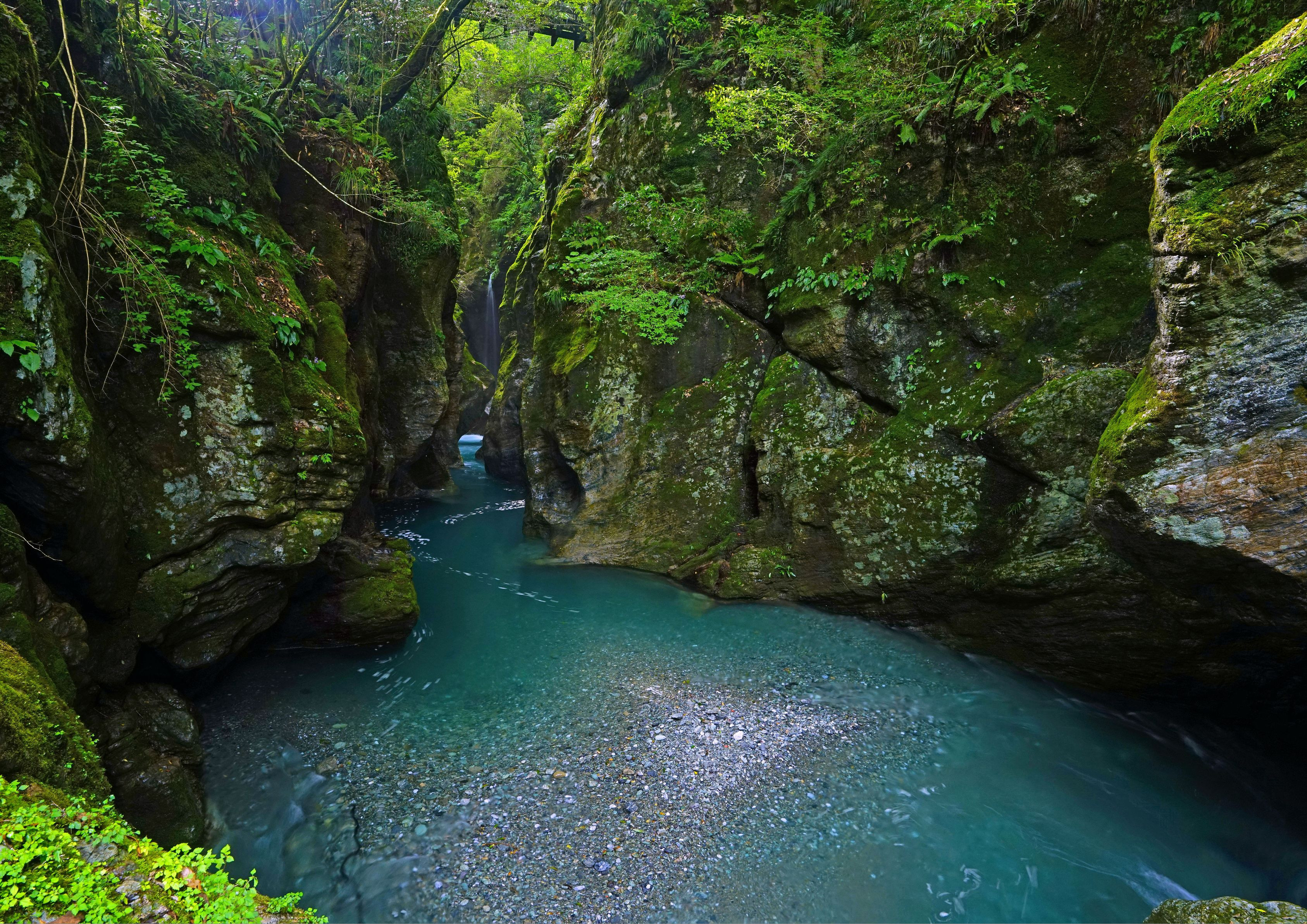 高知県の中津渓谷。遊歩道の最上流部、渓谷の中で最も幅が狭く岩盤が切り立ったところに千古の水流が彫刻を施した石柱があります。