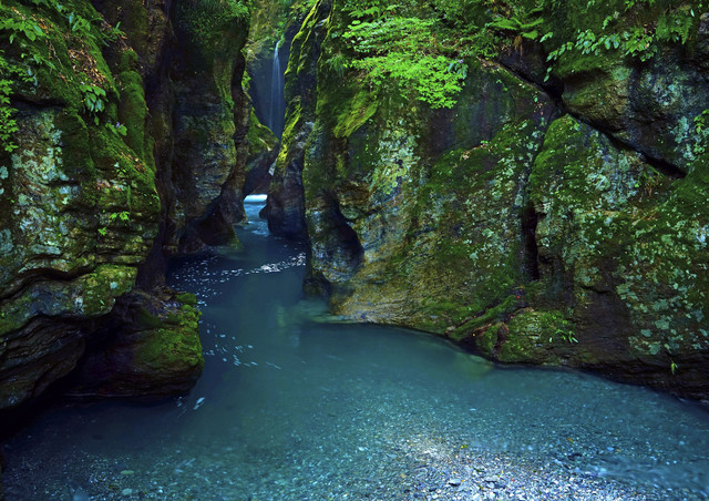 この石柱は谷底から約20mの高さがあり、また切り立った岩盤をえぐるようにしてできており、苔むした岩盤と仁淀川ブルーの水流が綺麗です。