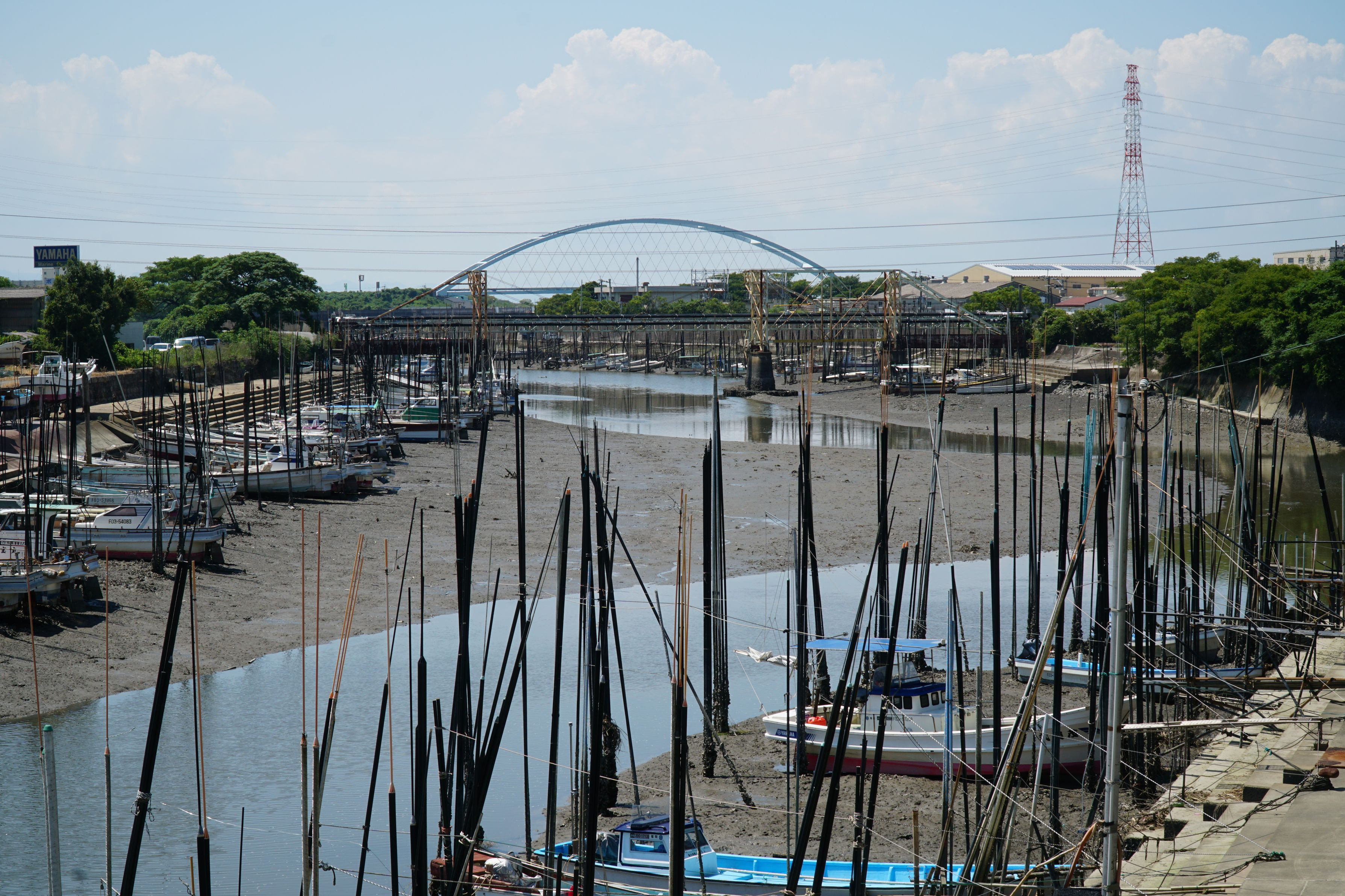 有明海に注ぐ大牟田市内を流れる白銀川の河口付近です。干満の差が大きい有明海河口の船は干潮時は地上に座っています。