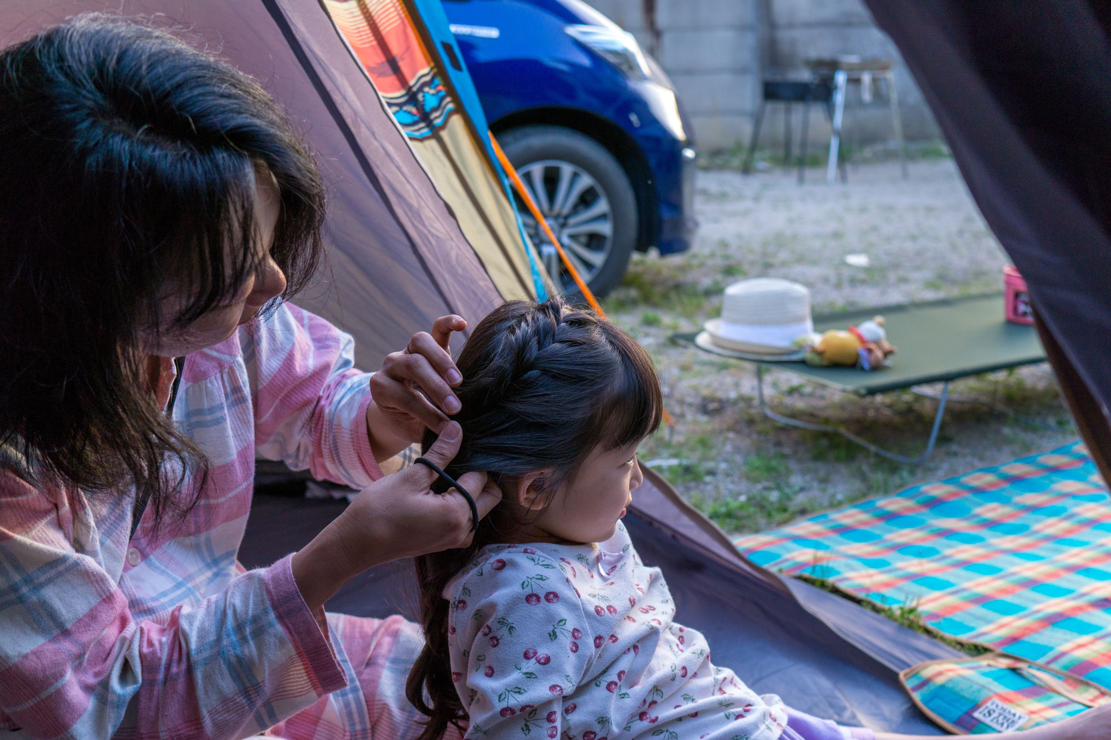 母親に髪を結んでもらっている、小学一年生の娘です。