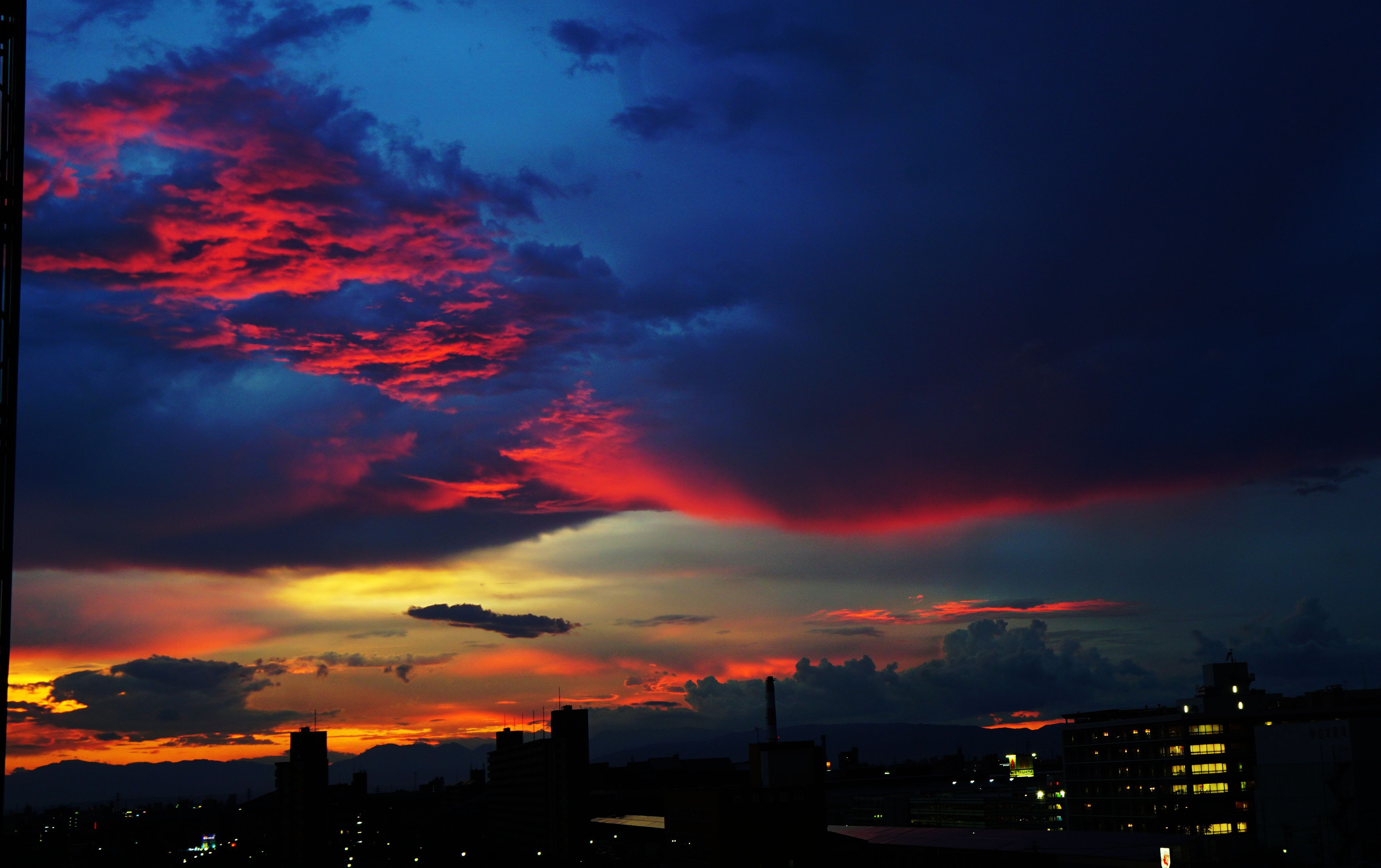 昨日愛知を襲った スーパーセル??? 雷雨襲来 30分! 落雷県内6900回以上 まだ 雨が少し残っていても 遠くには夕景が! 見た事の無い風景に カメラを持って9階自宅から・・ 色の移り変わりは早く 捉えるのも ピント合わせも間に合わず! しかしこの風景 まずは収めて・・ まだまだ居座る雨雲の向こうに見える陽の光・・