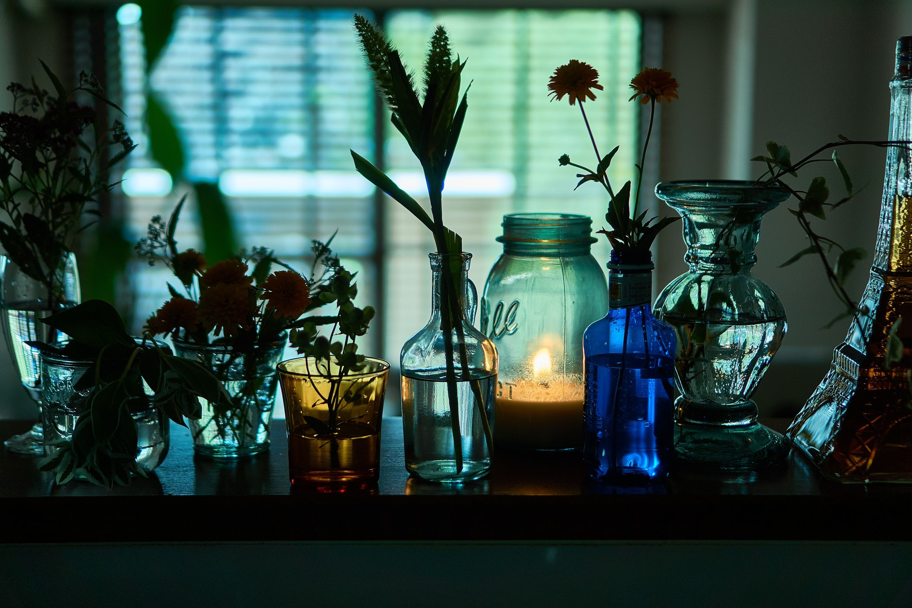 キッチンのカウンターに並べた花が涼しげでした。 ブランデーボトルや花瓶に写る光はコントラストを上げて強調しました。 緑色と青色もホワイトバランスで上げています。 EXIF情報がなぜか消えてしまいました。。(涙)
