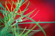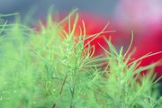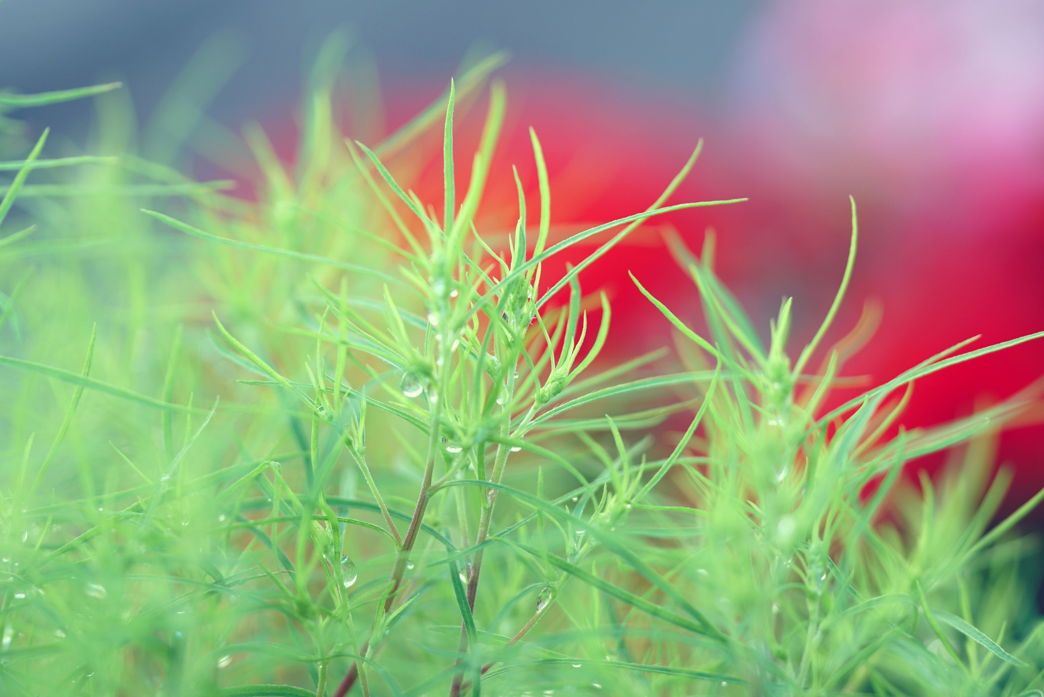 昨夜の雨がコキアに水滴を残してきれいでした。マクロレンズで背景にゼラニウムの赤を入れてみました。