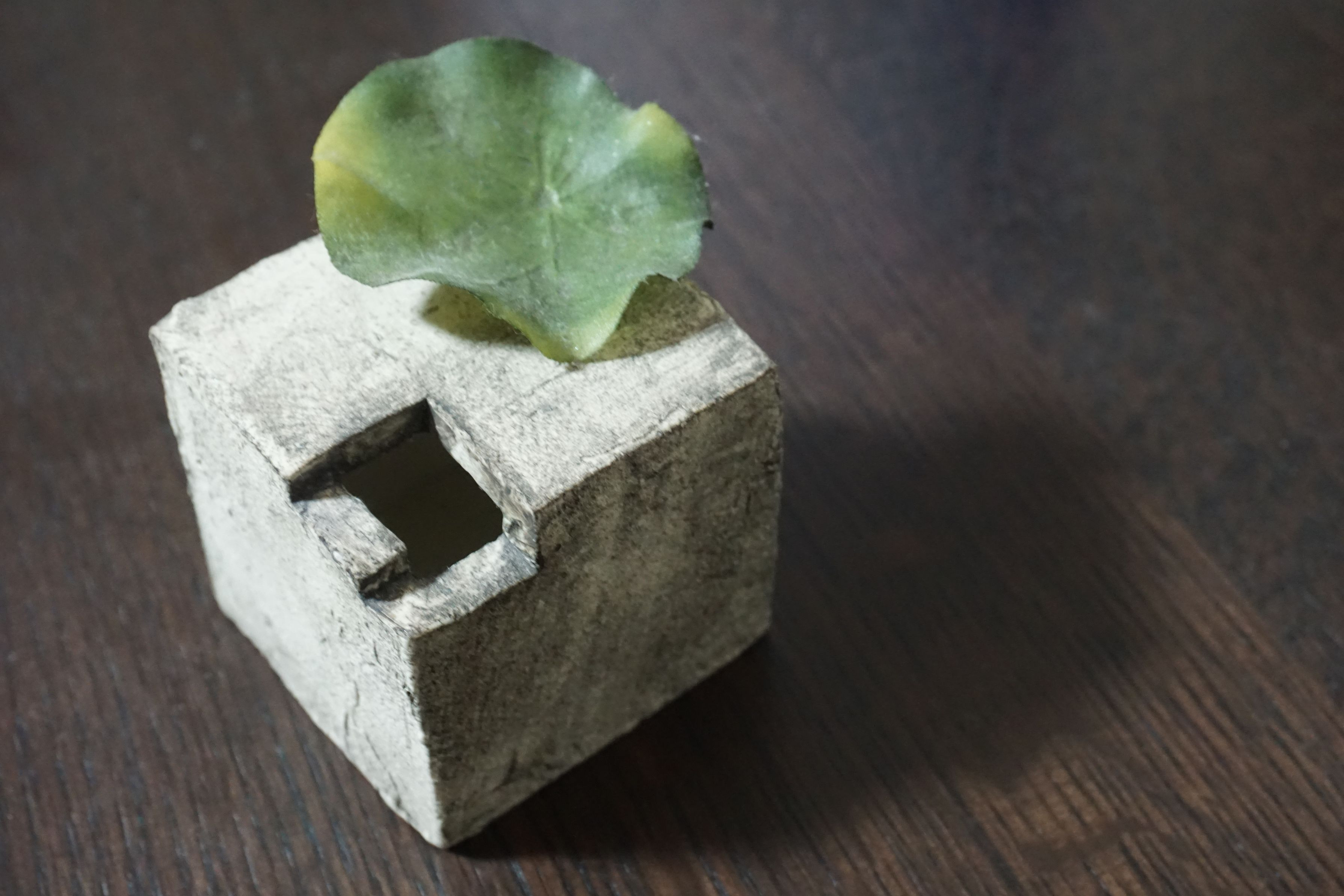 石作りの四角い一輪挿しに蓮の葉っぱを挿してみました。
