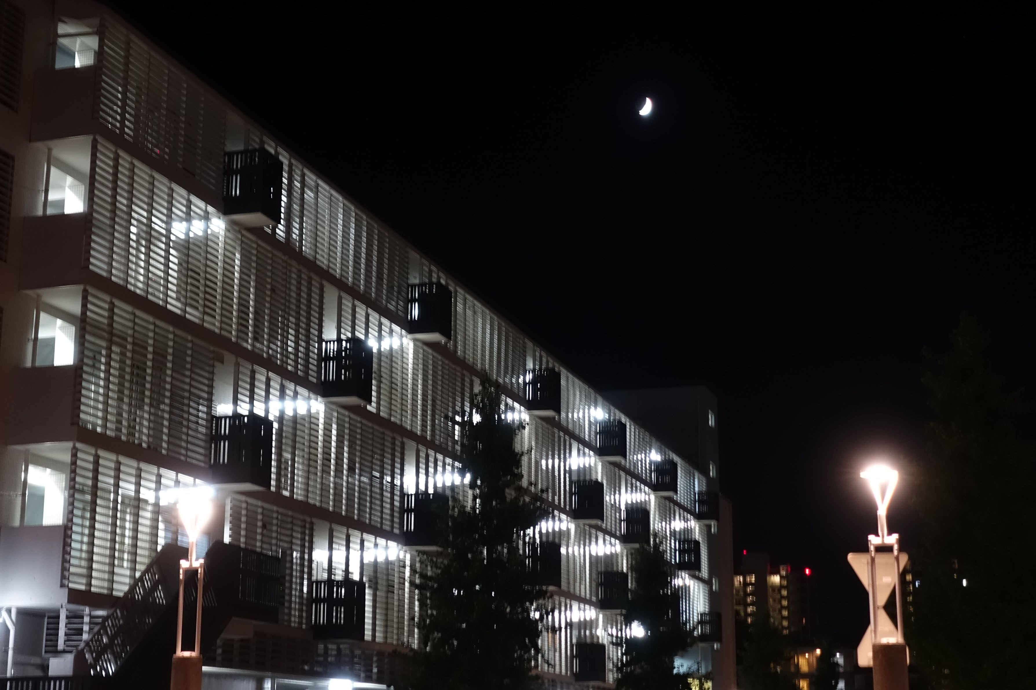 ビルの照明と街灯の明かりと月の光に照らされた人気無い夜の通りです