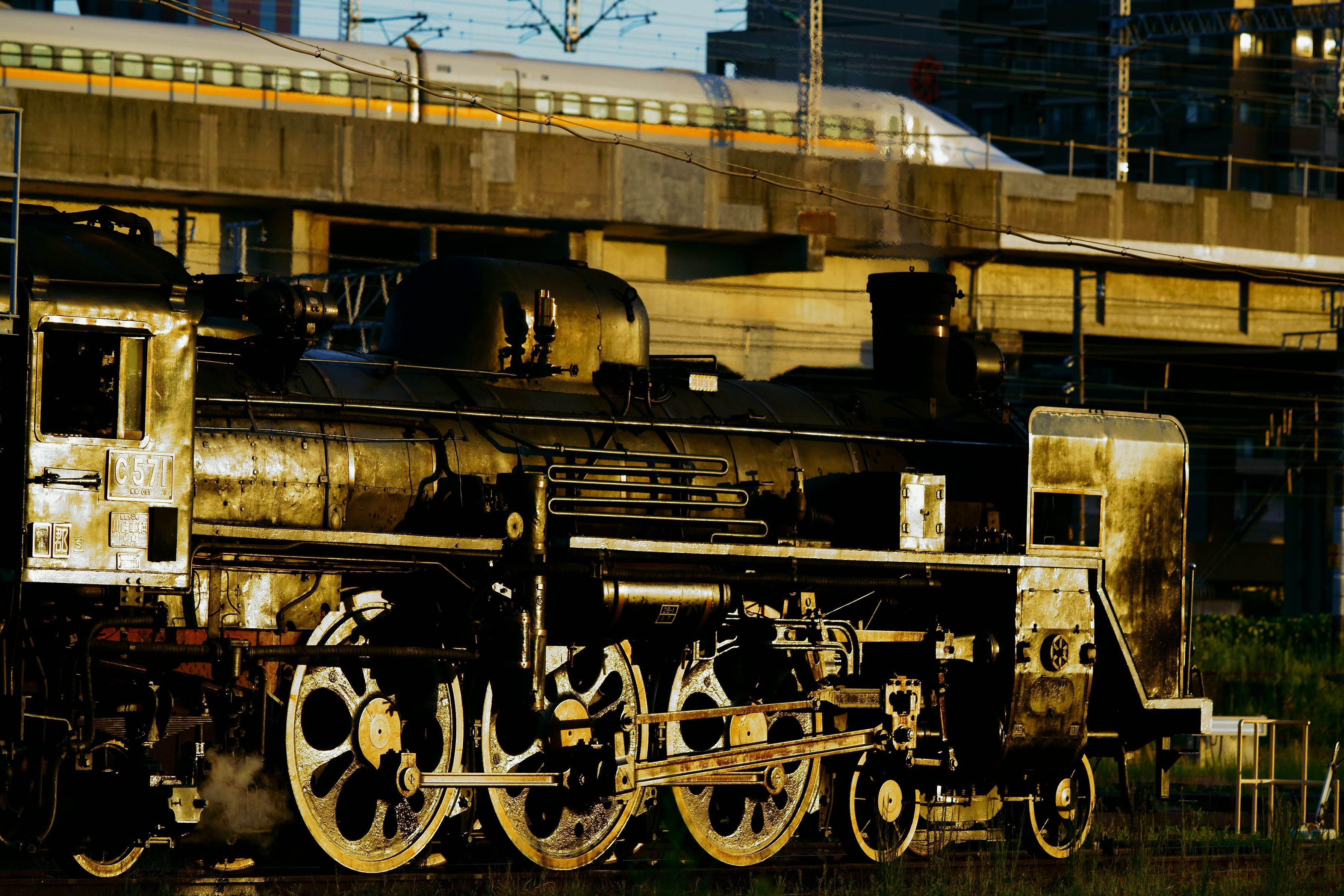 1日の終わりに新山口での一コマです。 夕日がC57の車体に当たり綺麗でした。 敷地外よりフェンス越しに撮影しました。
