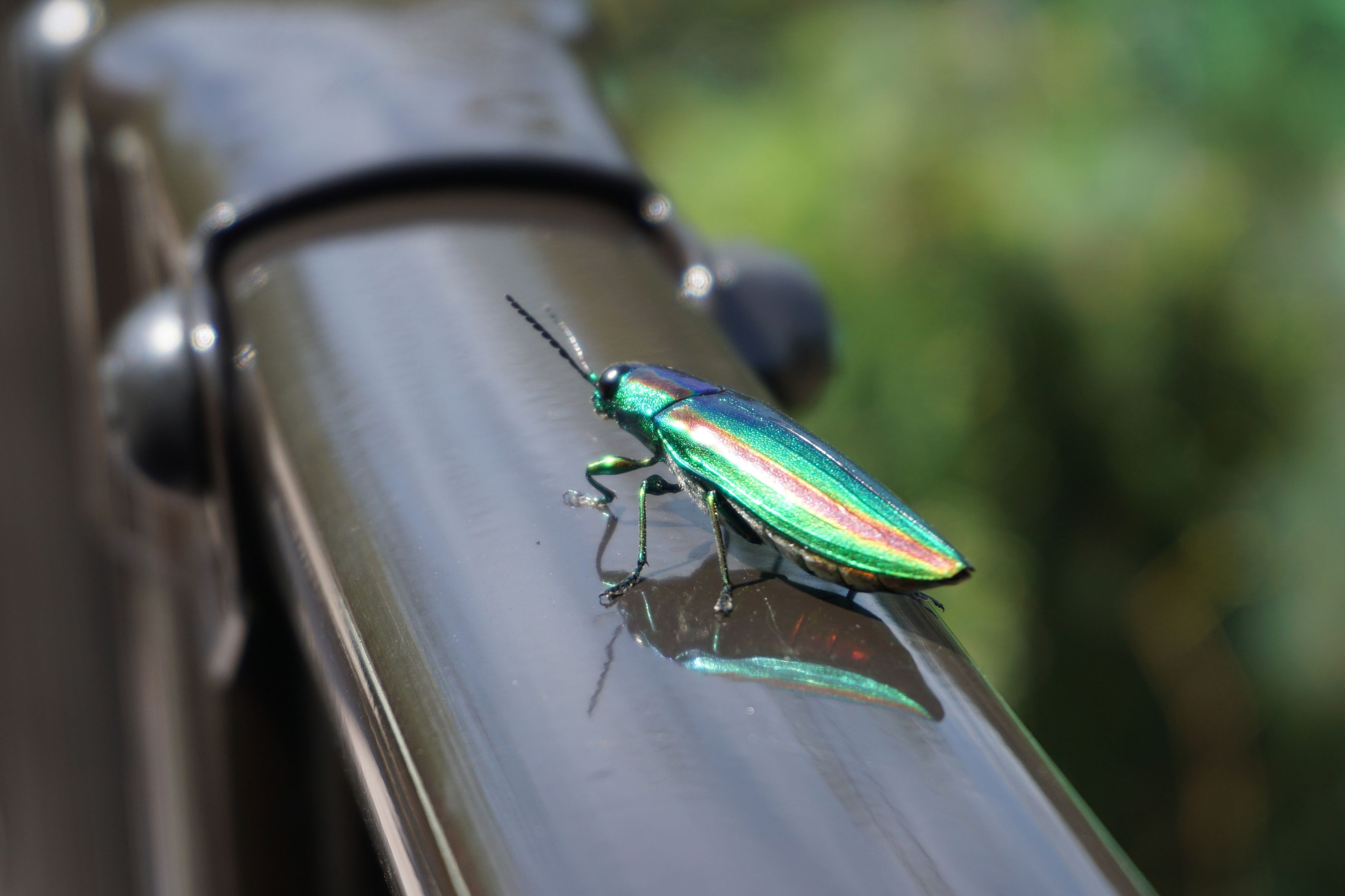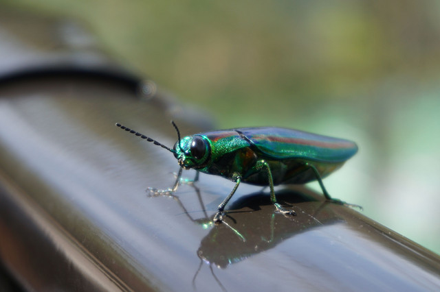 関西サイクルスポーツセンターでたまたま見つけたきれいな虫。 調べたところ、ヤマトタマムシみたいです。 愛想良くカメラ前で360度一周してから飛んでいきました。