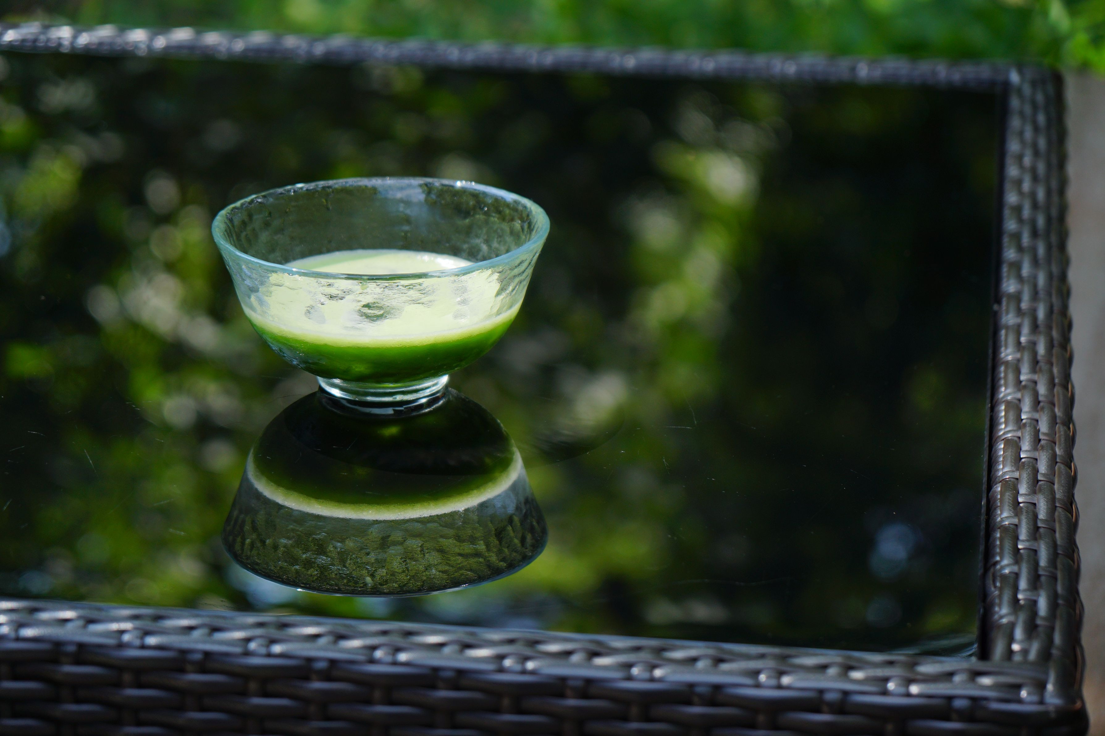 来宮神社で五色の杜という場所、静岡抹茶と鏡テーブル。