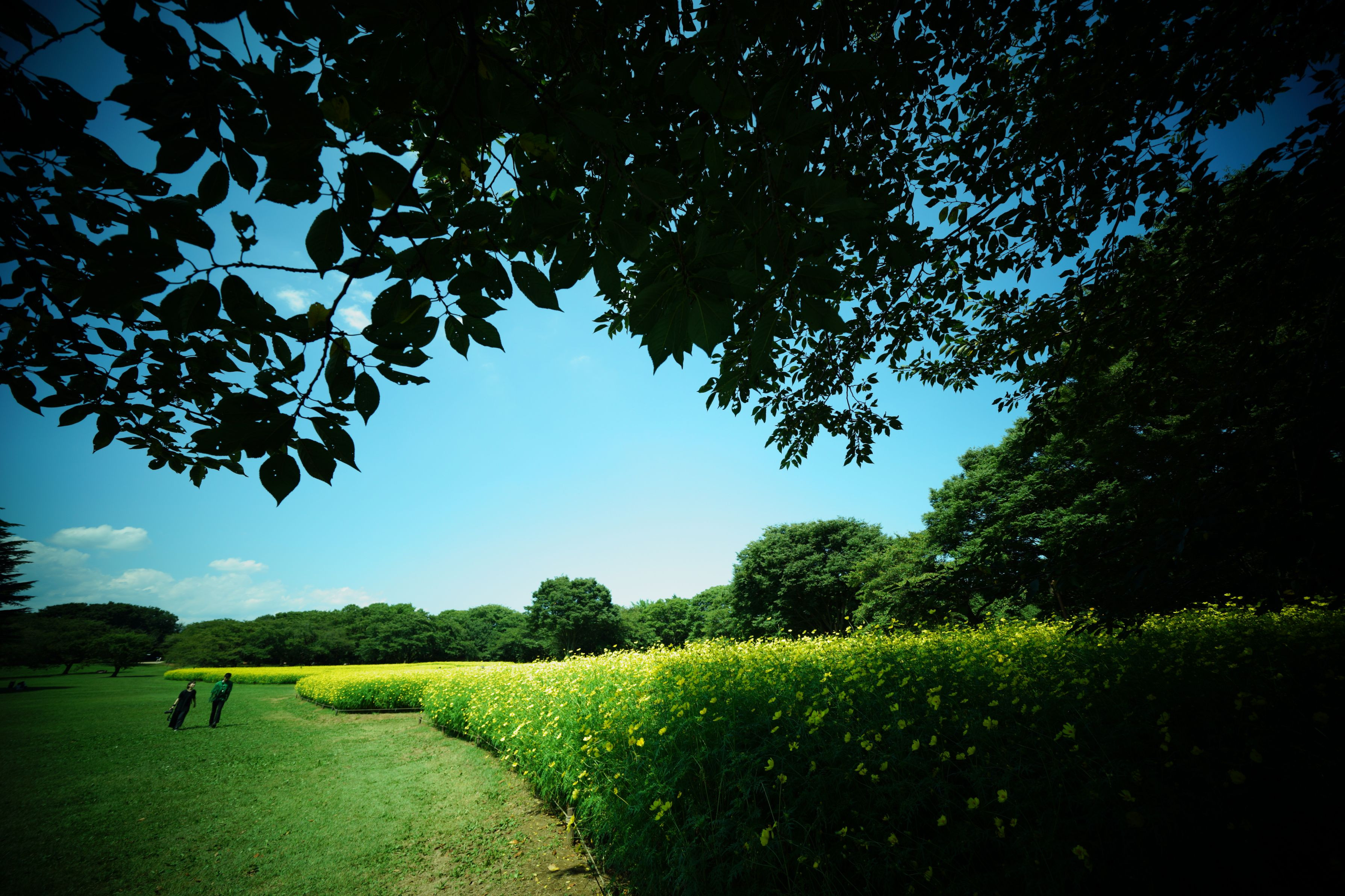 木花コスモスの横を歩く、女性はカメラ持参してました。 天気のいい、熱いくらいの日中でした。