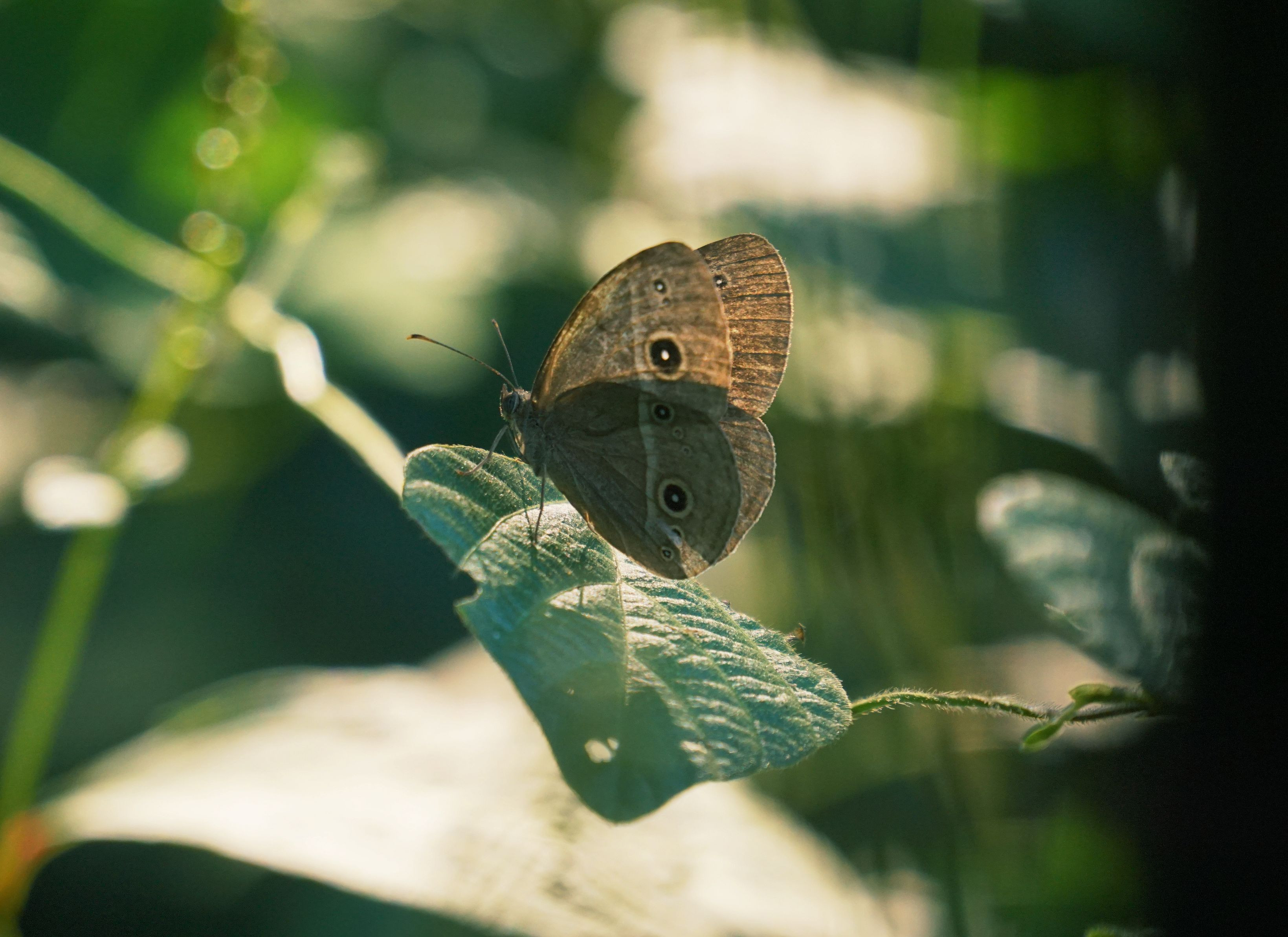 夕暮れの林 はっぱのテーブルで翅を開いたり閉じたりダンスしています。