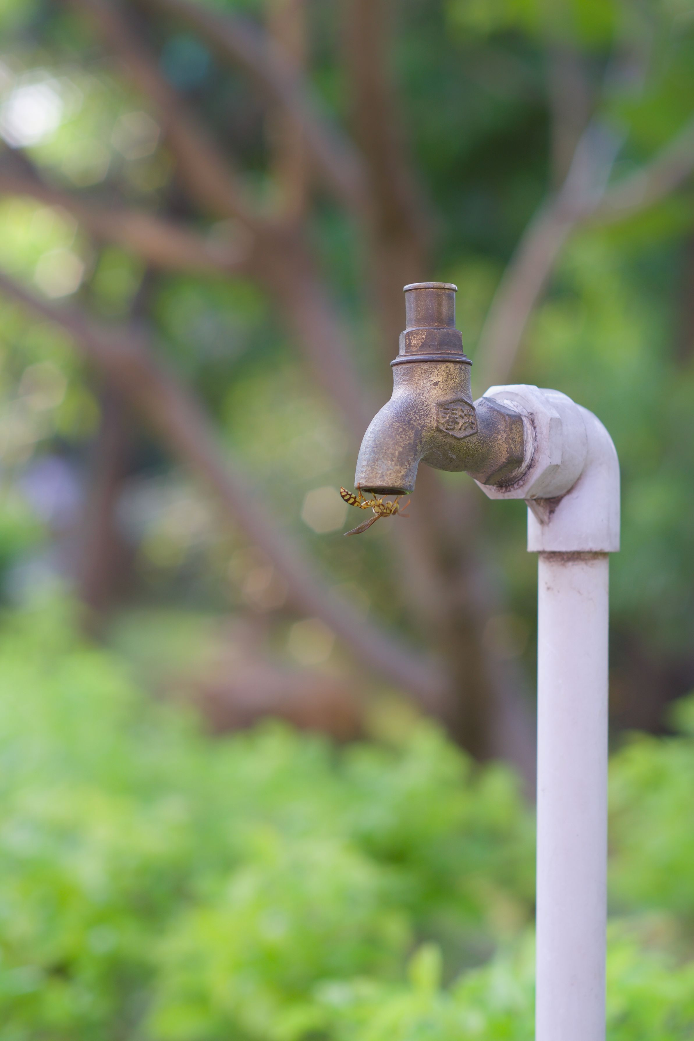 この蛇口を撮っていたら、思わぬ来客。蜂も喉が乾くようでした。