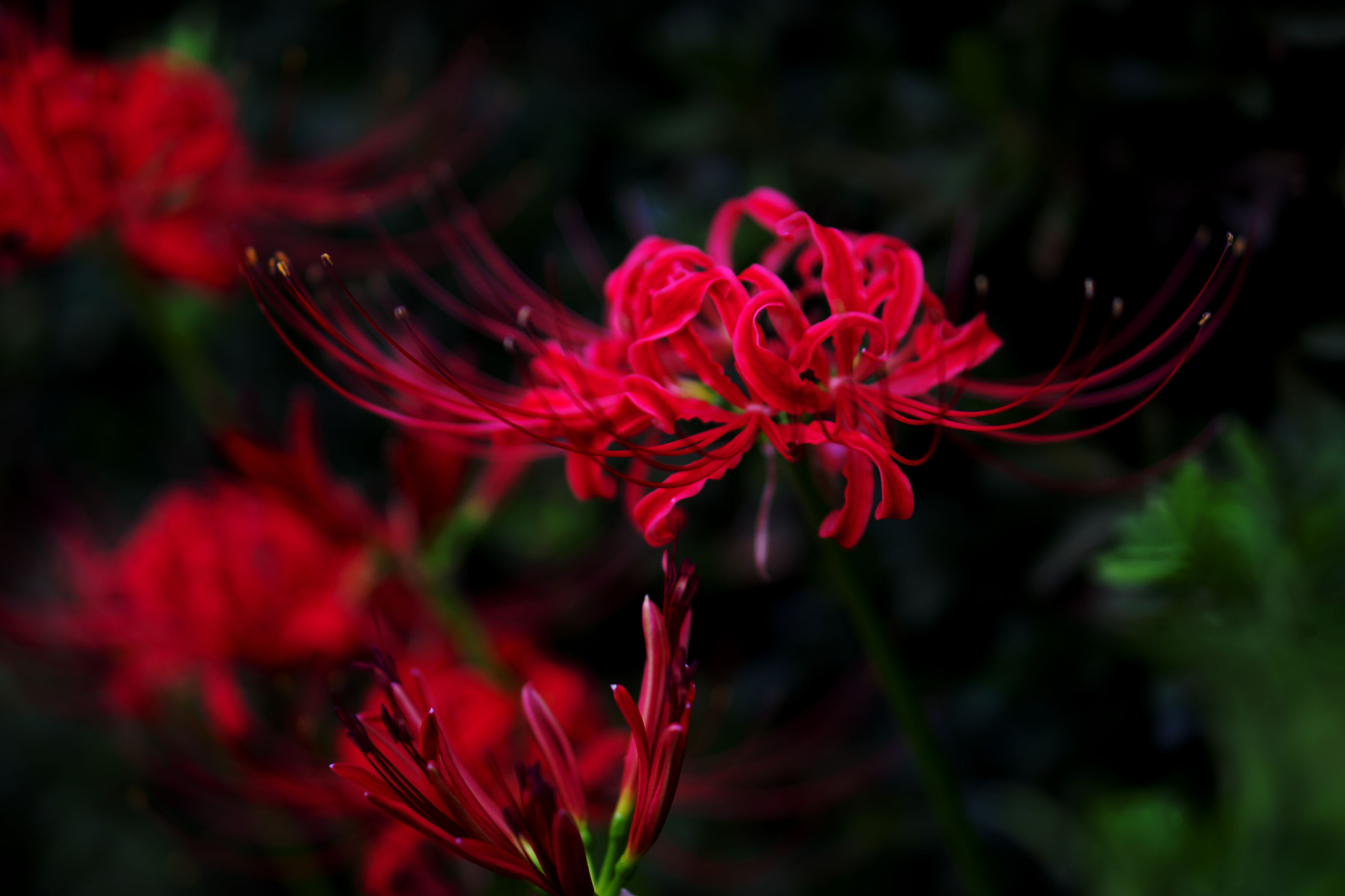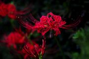 歩道花壇の彼岸花の最終です。 夕方で暗くなりかけた赤彼岸花をコントラストを上げて赤と黒を強調しました。