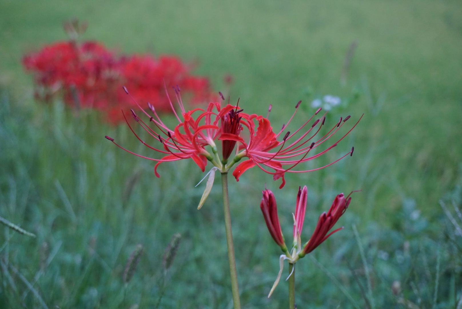 田んぼに紅色が点々と。