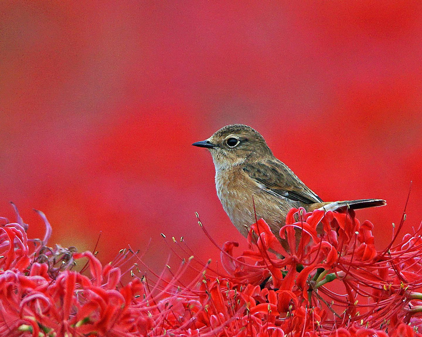 #ノビタキ#が越冬地にへの帰りに地元のたんぼに立ち寄った。 偶然にも満開の彼岸花が出迎えた様だった。