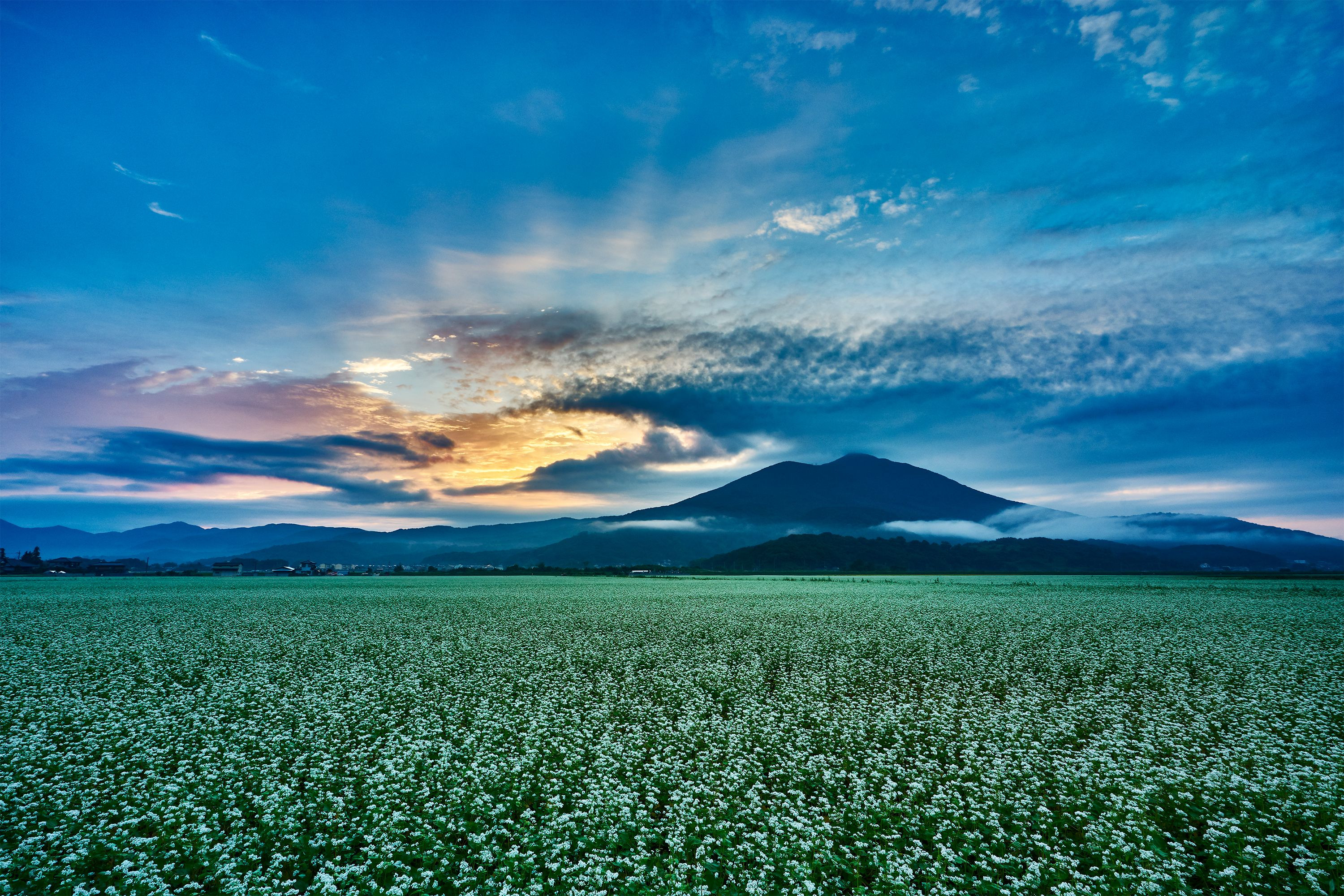 蕎麦畑の向こうの筑波山北端からの日の出を筑西市から眺めています。レンズはSEL1635GM。