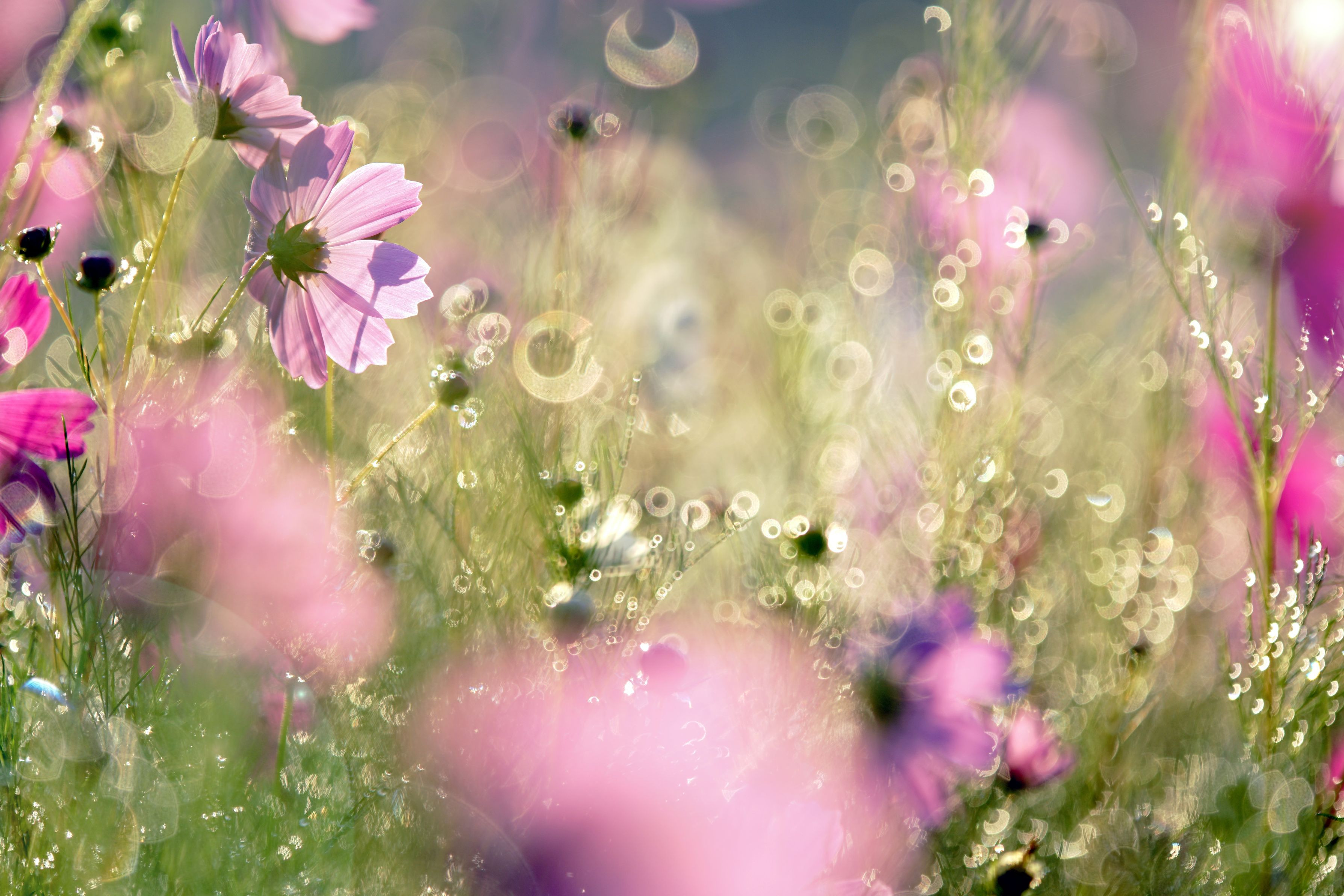 秋桜畑に降り注ぐ朝陽☀ キラキラと光り輝く朝露たちが、とても綺麗でした(^^♪