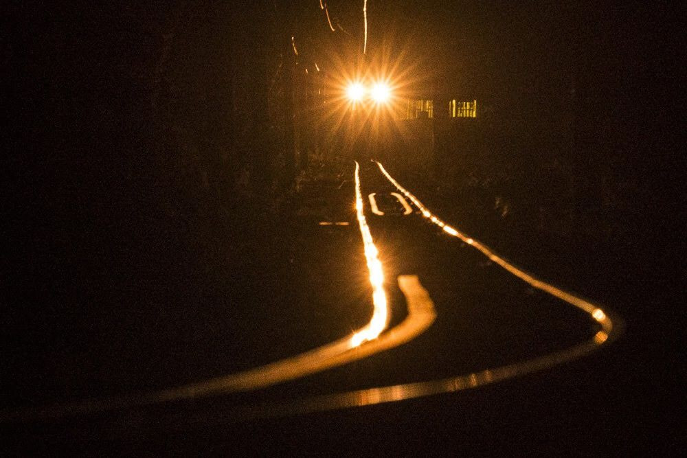 三岐鉄道 北勢線は、JRの7割ほどのレール幅しかないナローゲージの線路を採用している。 その速度も30kmから45kmとゆっくりいる。 夜、カーブを曲がって列車がやって来た。 その姿は郷愁を誘う。