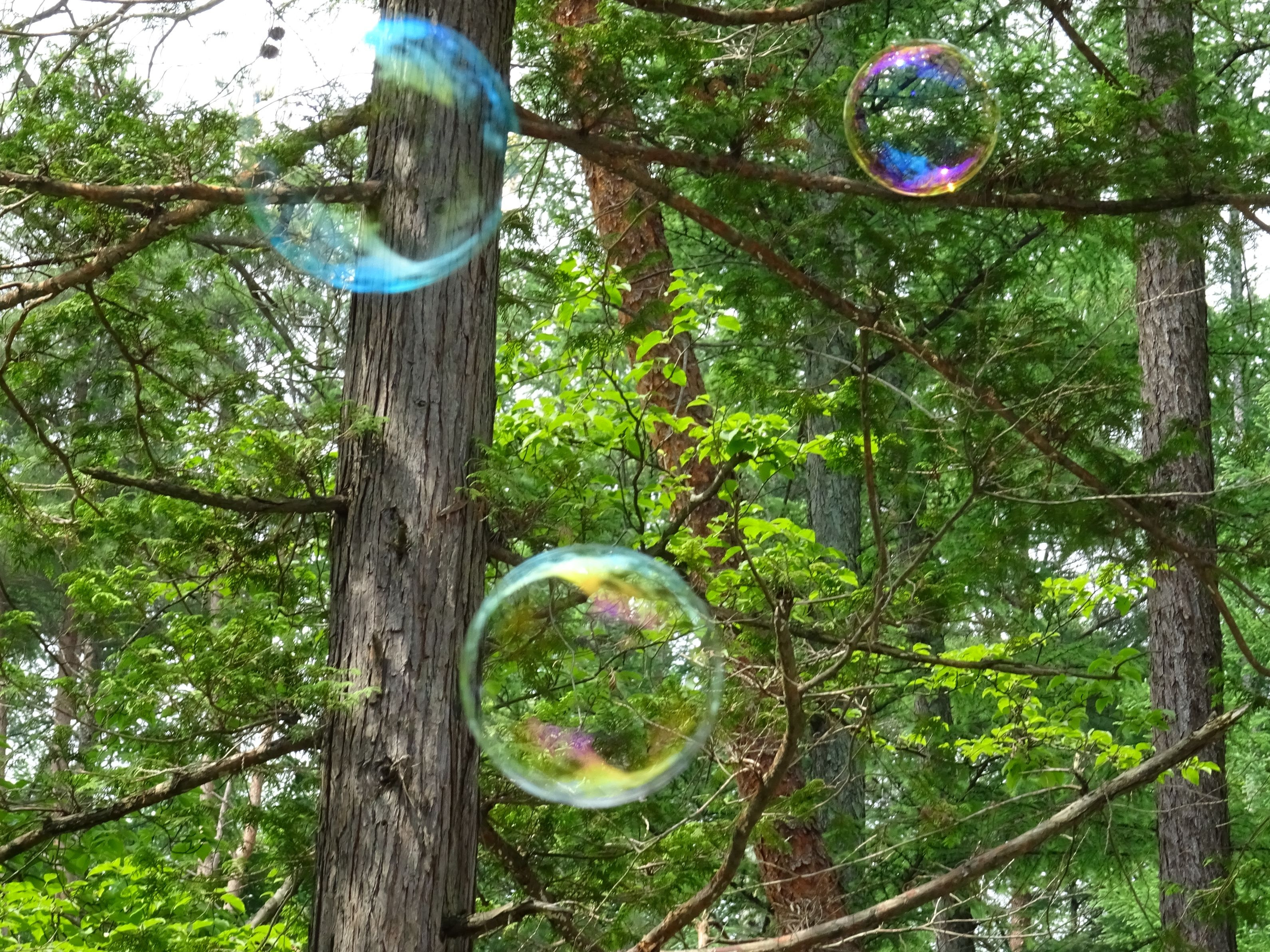 普通の林の中ですが、シャボン玉から見ると、少し違って見えて新鮮な感じがしたので撮っていました。