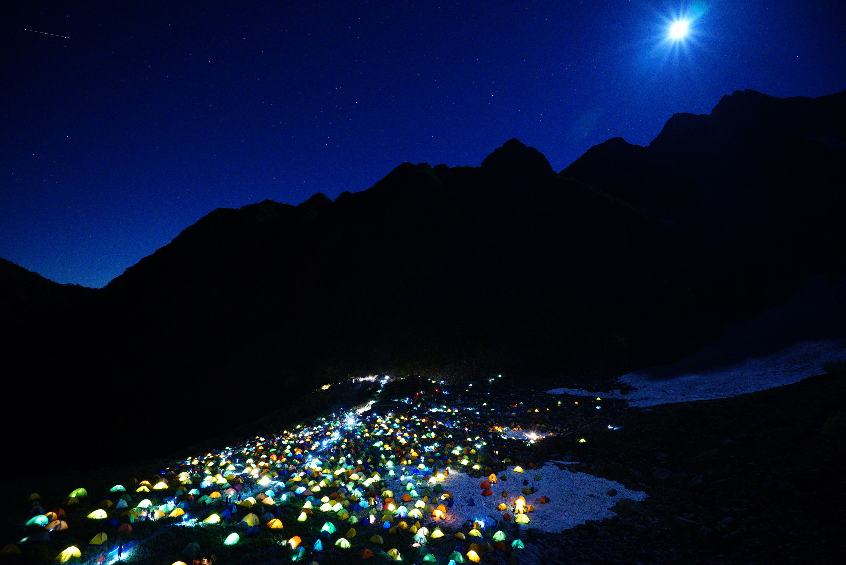 夜は紅葉に代わってきらきらのイルミネーション!(*^-^*) この日のテント数は1400張とか・・・! 秋の北アルプスのもうひとつの風物詩です。
