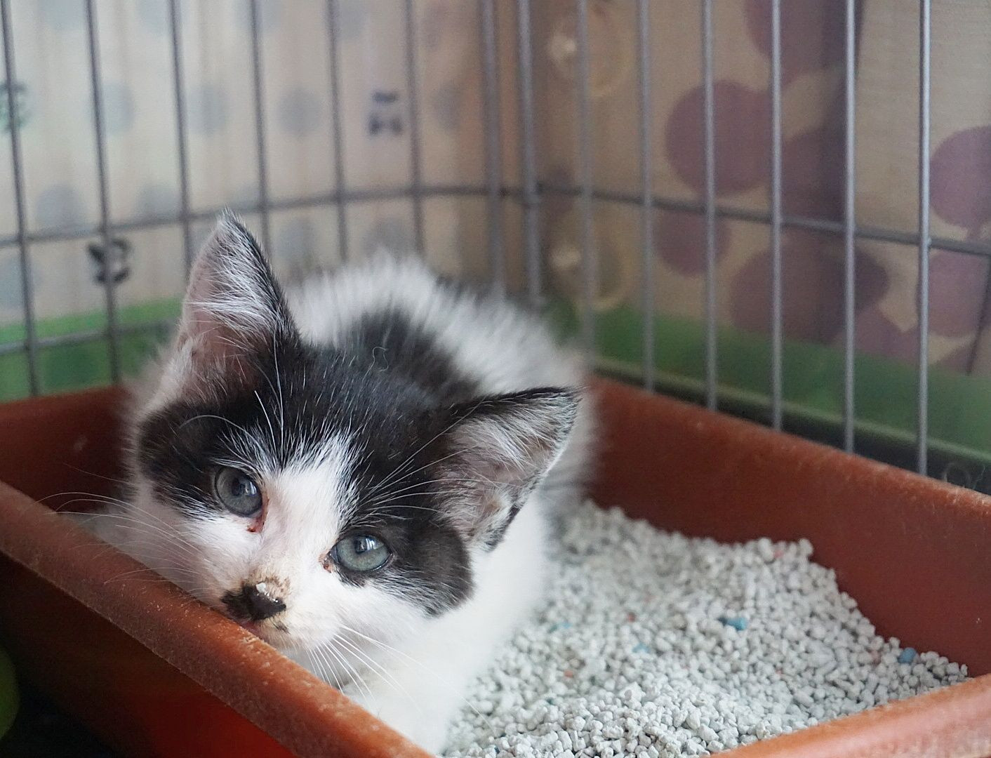 車が激しく往来する道路でうずくまっていた子猫。保護2日め。