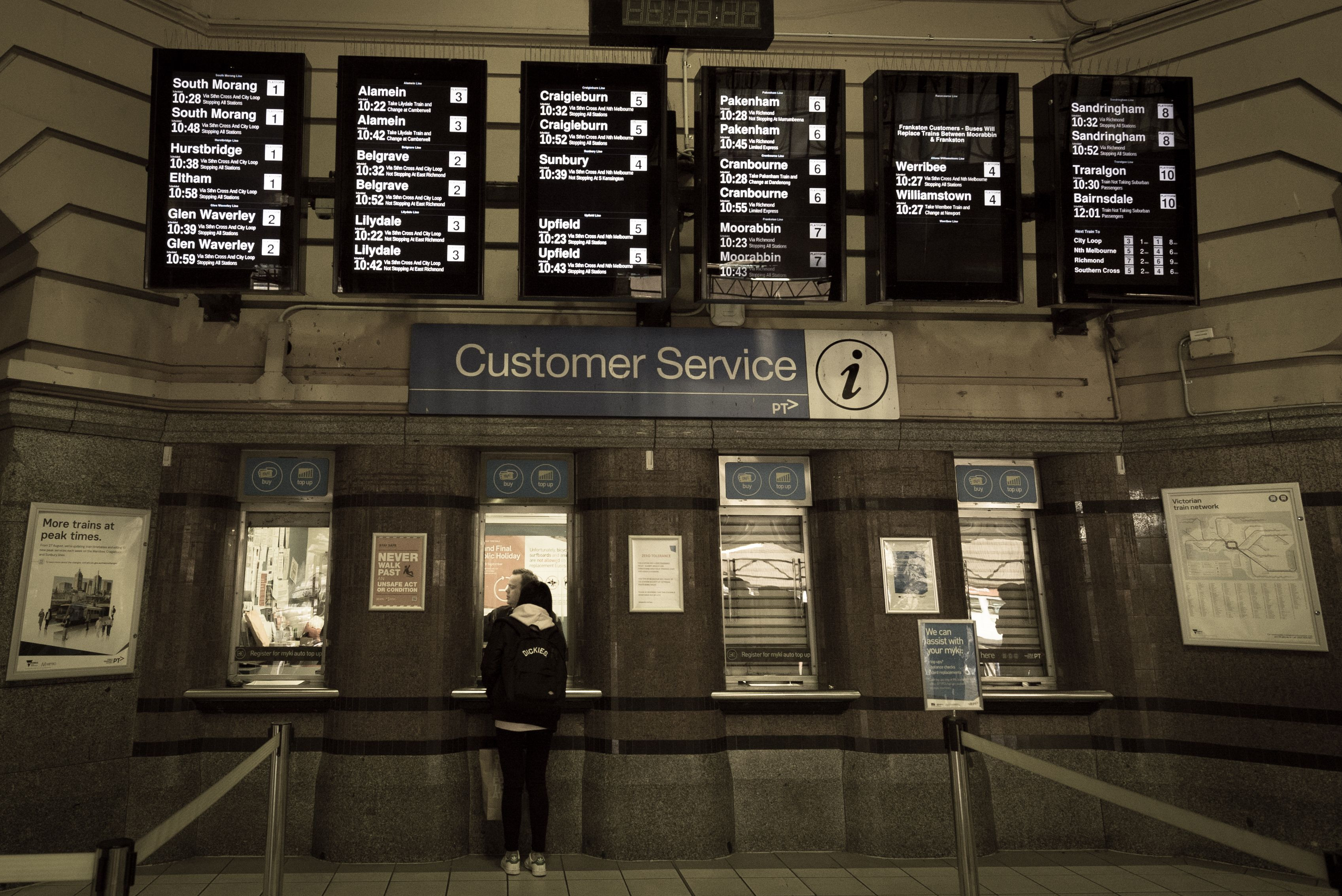 メルボルン市街にあるメトロのターミナル、フリンダースストリート駅。駅舎は歴史のある建物で、観光スポットにもなっている...んですが、残念ながら改修工事中でその外観は拝めず。とは言え、駅舎の中もなかなか趣きのある景観だったので、これはこれで見応えありでした。