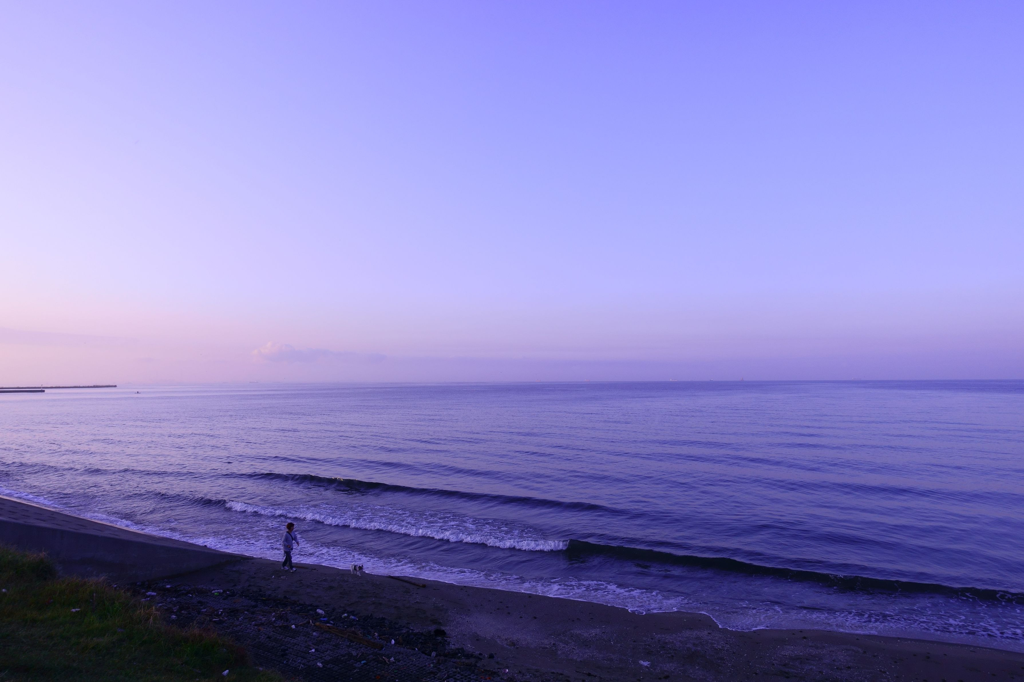 黎明の清々しい空気の中を犬と一緒に海辺の散歩です