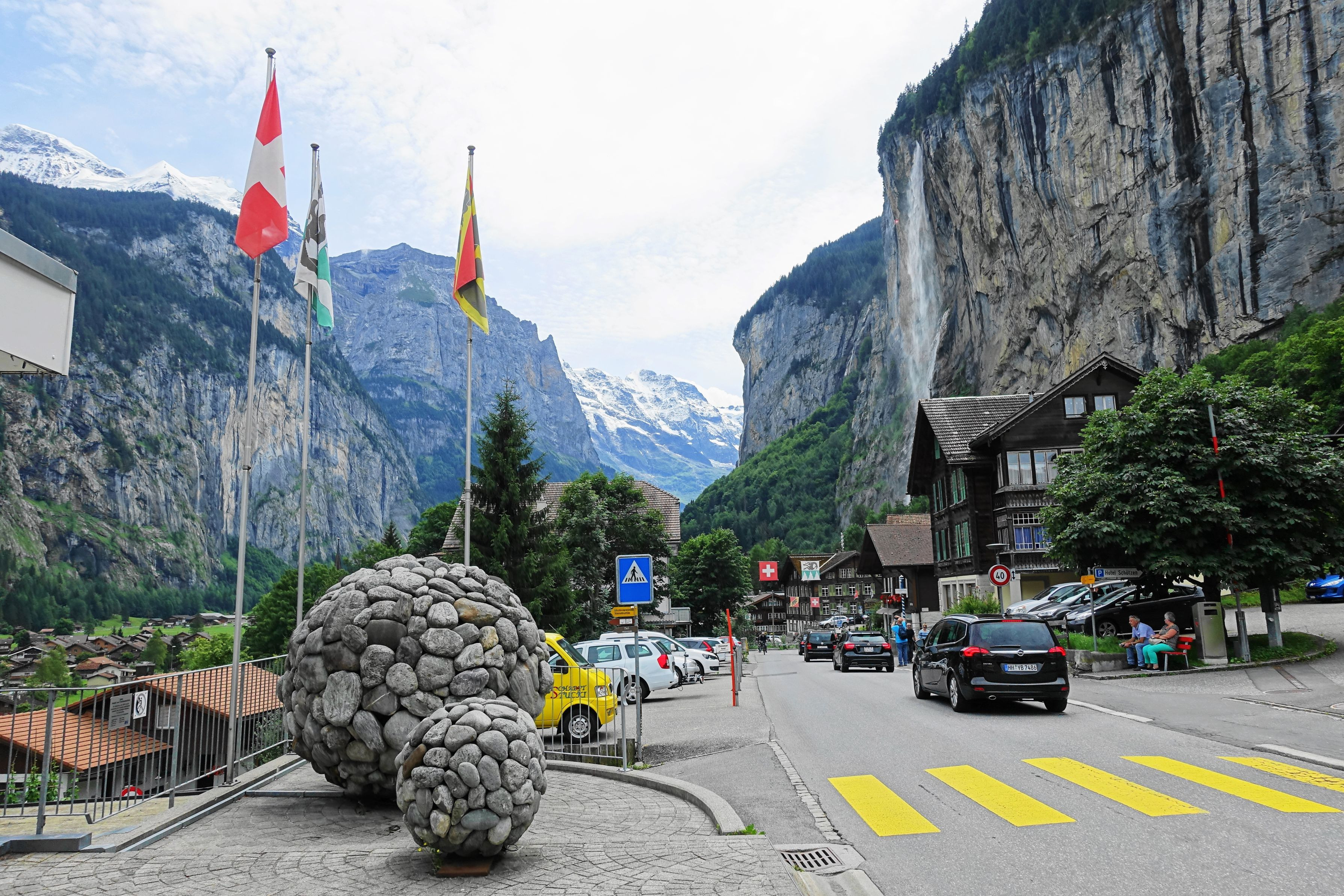 ラウターブルネンはユングフラウの懐にあり、氷河に削られてできたU字谷の谷底に広がる集落。高さ約300mの断崖が両側に迫り、多数の滝が流れ落ちている。 正面中央に見える山はブライトホルン(標高3782m)。 ユングフラウはその一部が左上方に白く雪を被って姿を見せている。 右側には落差287mのシュタウプバッハの滝の上部が見える。