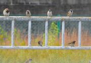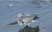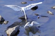 ダイサギが襲うコサギ、 アオサギも魚追っかけ逃げられる。 雀も観戦