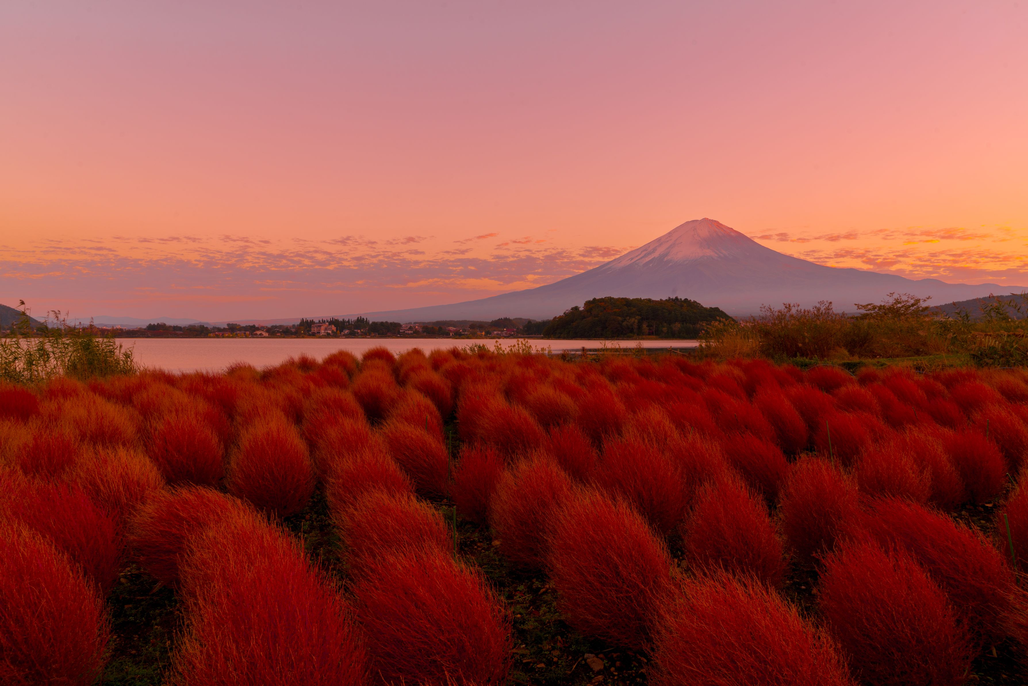 赤いコキアとオレンジ色に染まった富士山が綺麗でした。