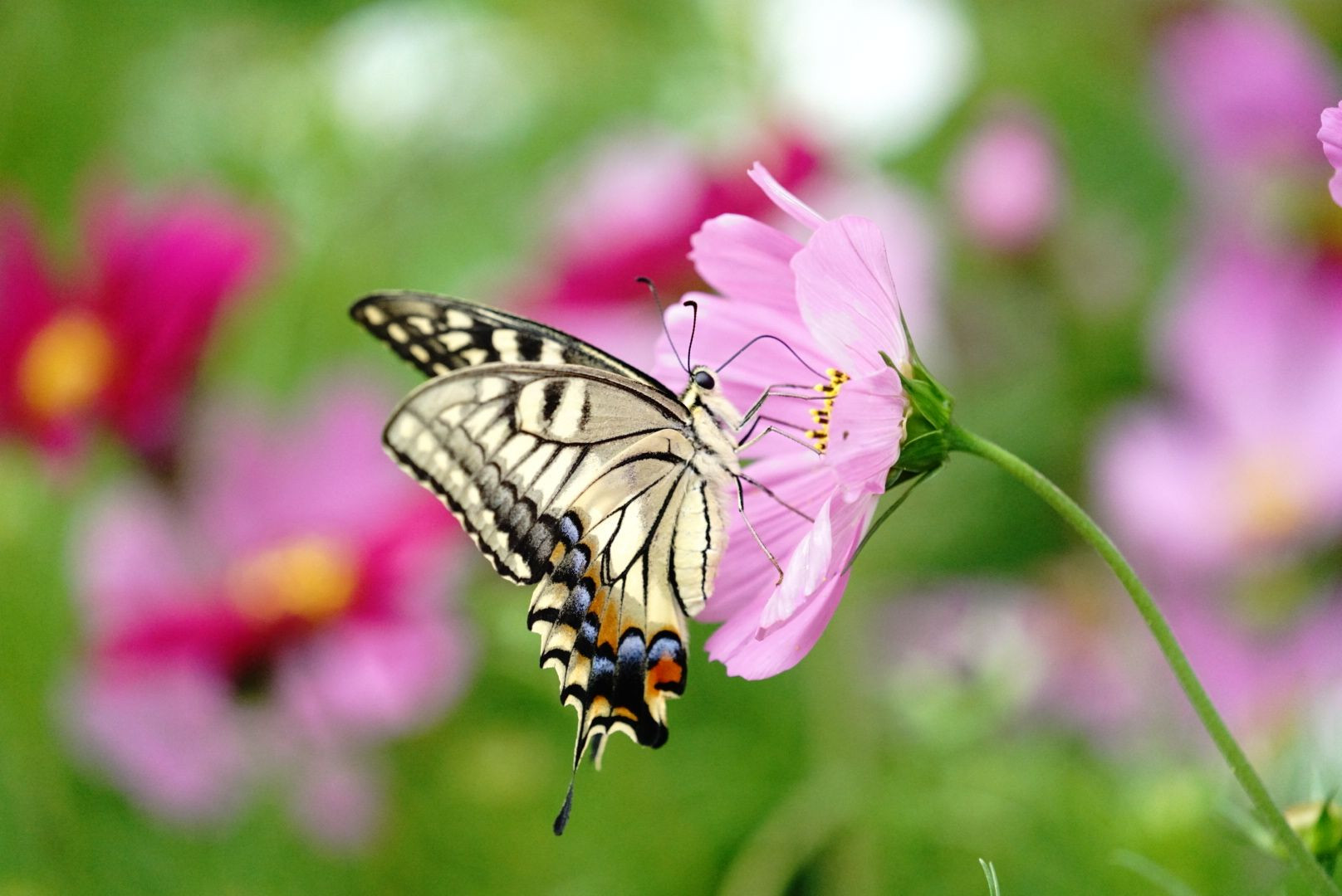 コスモス畑で夢中になって食事をしているアゲハ蝶を撮りました(*ˊᵕˋ*)