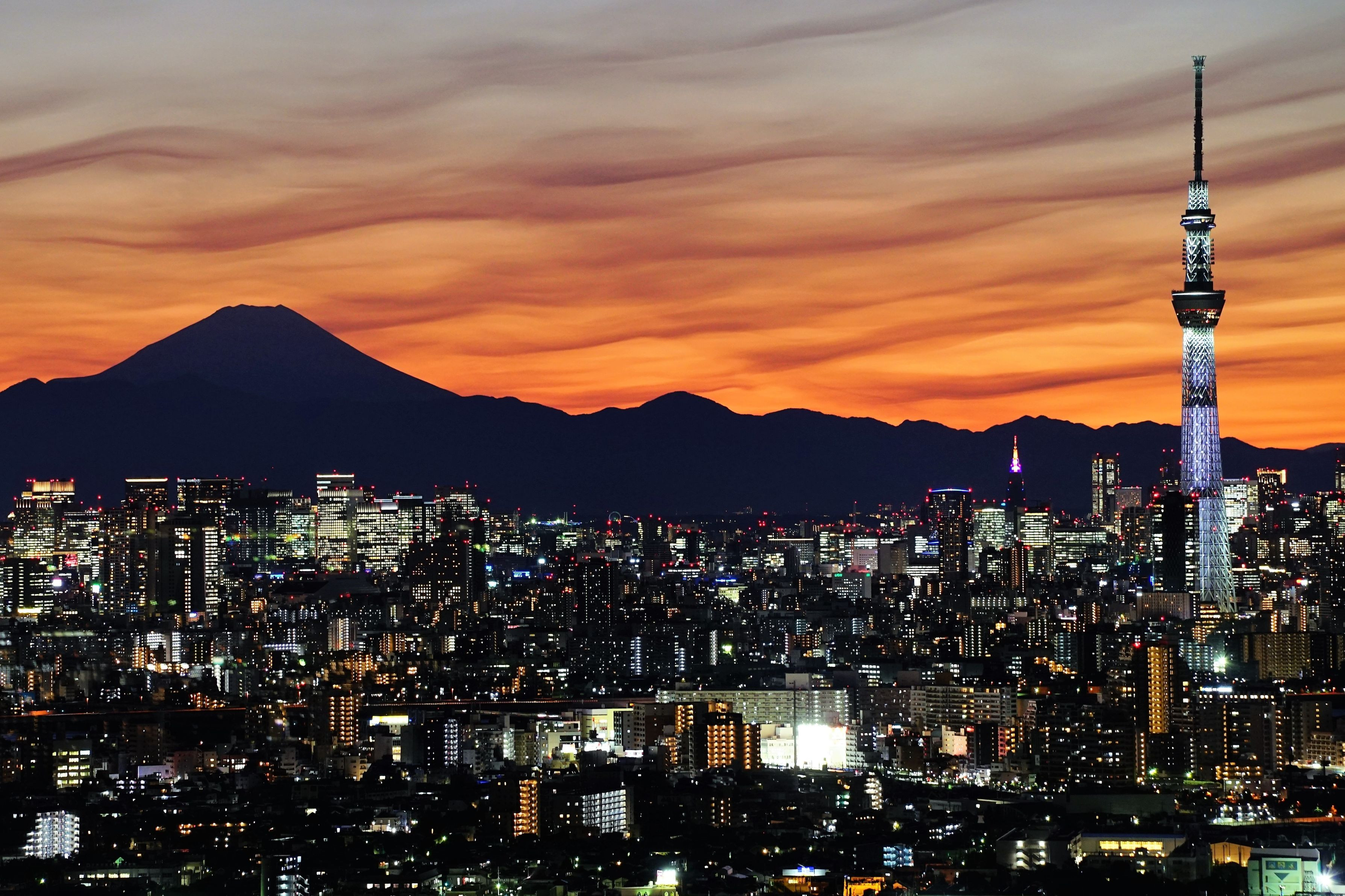 日本を代表する富士山とスカイツリーのツーショットです。 富士山の後ろで波をつくる雲が雰囲気ありました。
