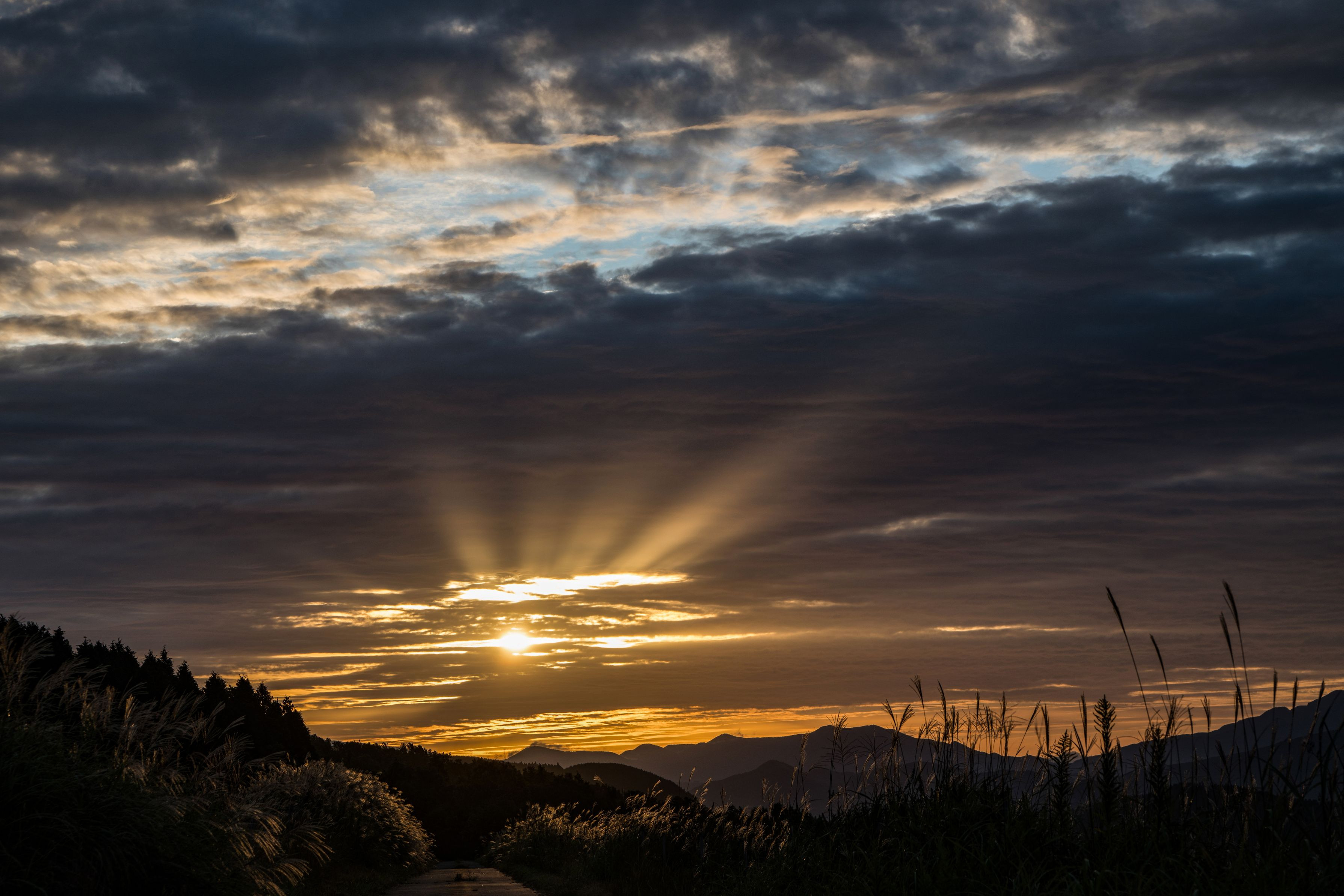 曇の間から一瞬の光九重連山を引き立てました。