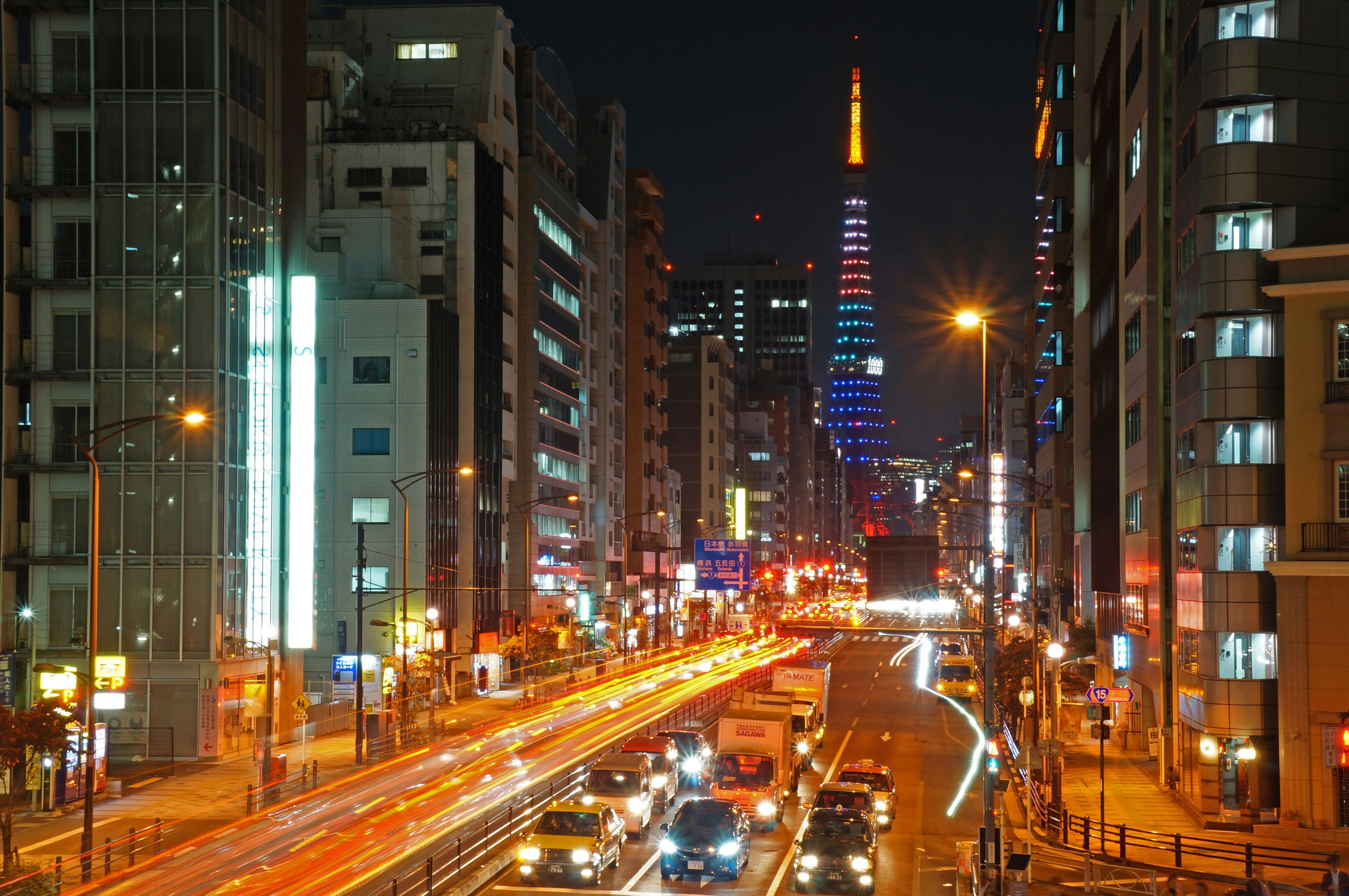 東京2020オリンピック1000日前を記念して東京タワー五輪カラーにライトアップされました。 札の辻交差点の歩道橋から五輪ライトアップされた東京タワーと車の光跡を撮りました。