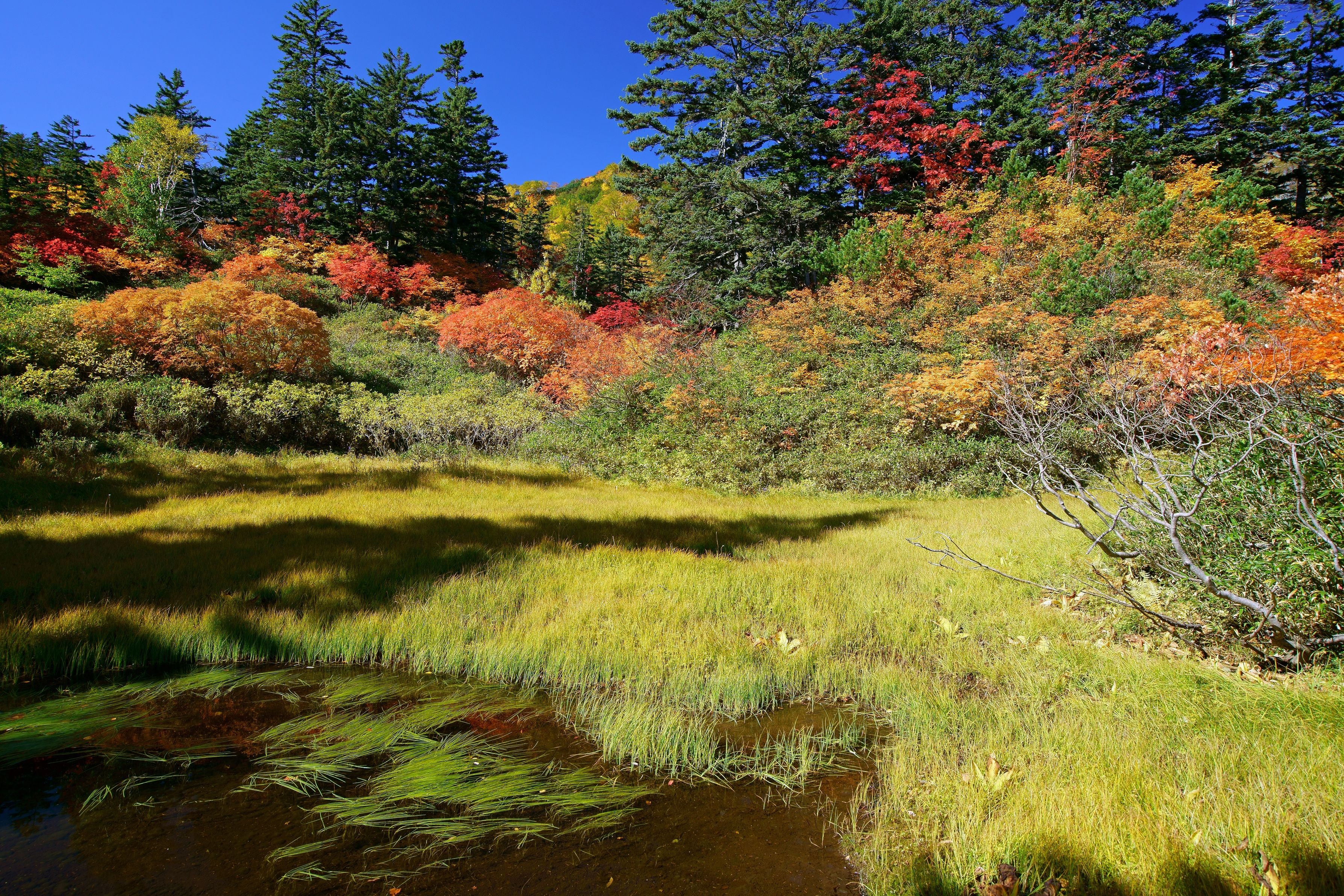 湿原に映った影と日の当たる紅葉がミスマッチで面白かったです。