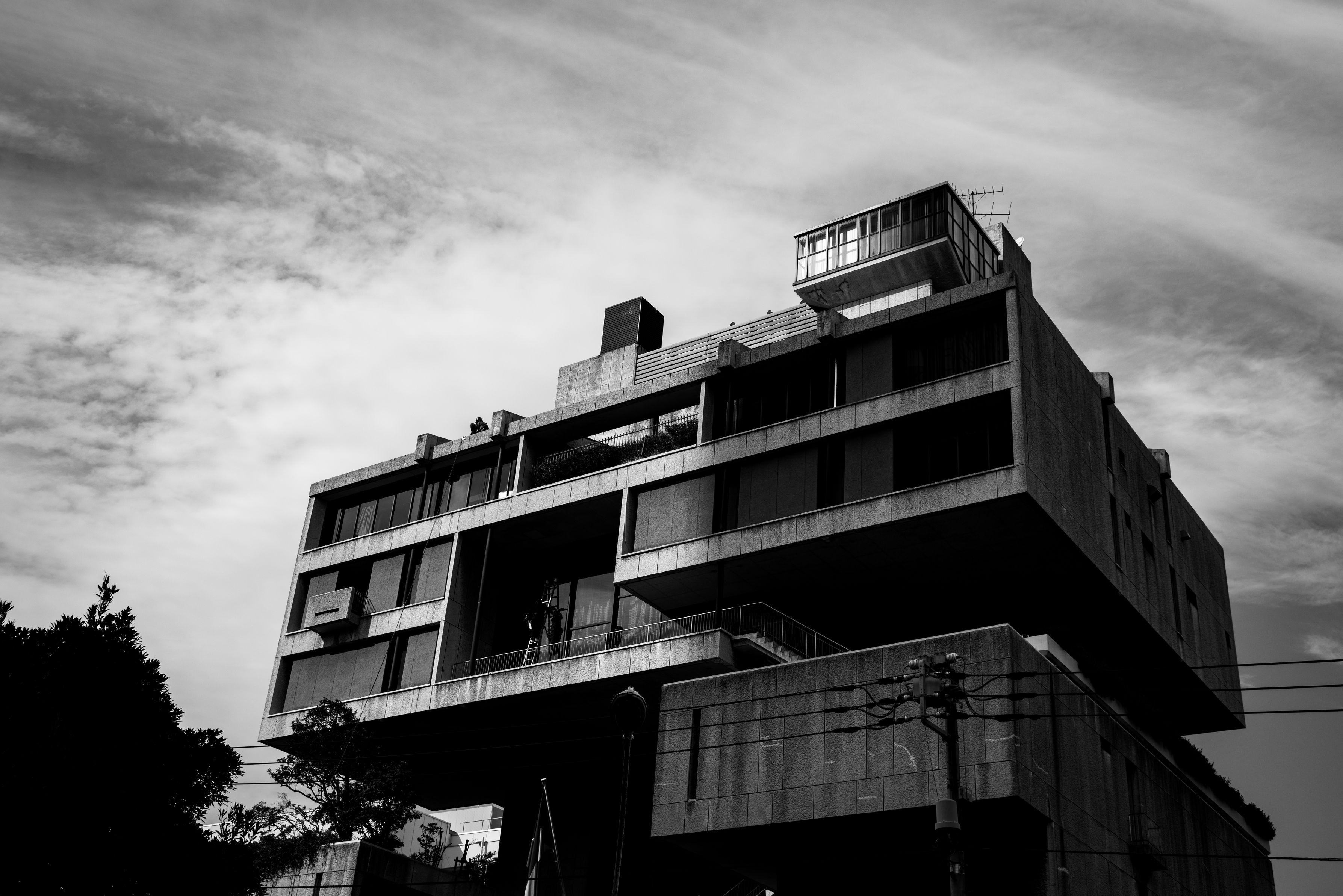 モダニズム建築の名作であるクエート大使館(設計:丹下健三 氏)を撮影しました。 コンクリートで作られたシャープなフォルムを、モノクロで表現しました。