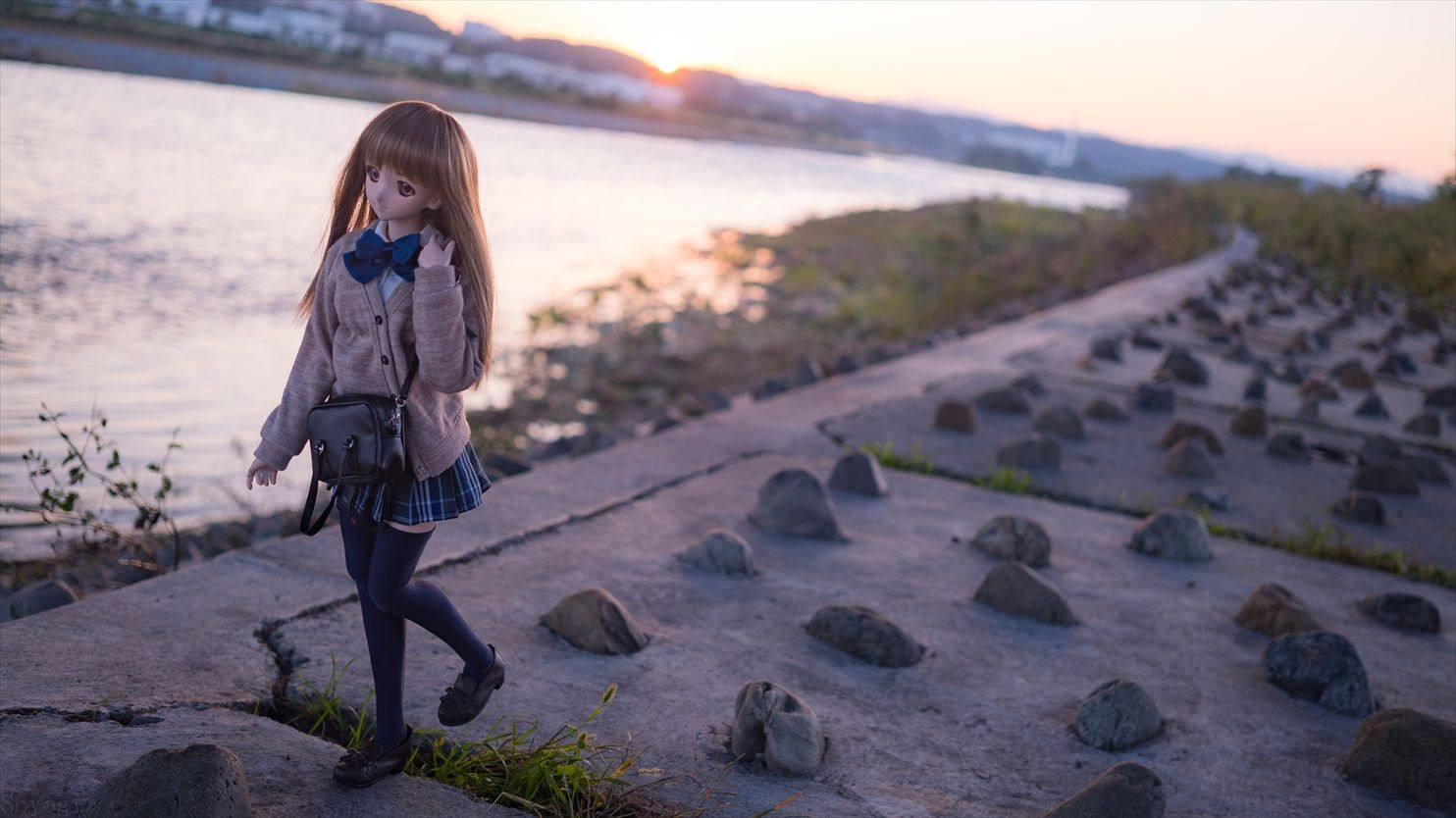 秋の多摩川をアンニュイな感じで歩く少女を演出しました。 もっと可愛い仕草を追及できればよかったと反省 ちなみに右足に見えないようにスタンドを沿わせてます。 基本この子達は自立はできませんのでスタンドを見えないように して撮影します。