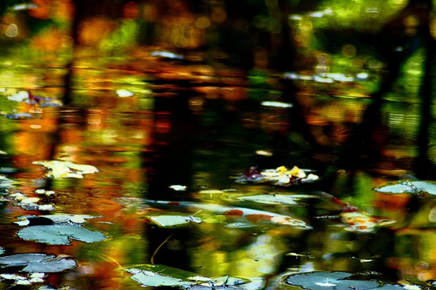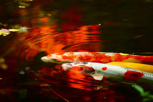 紅葉が池の水面に写り込み、錦鯉が泳ぎ波紋が広がります。