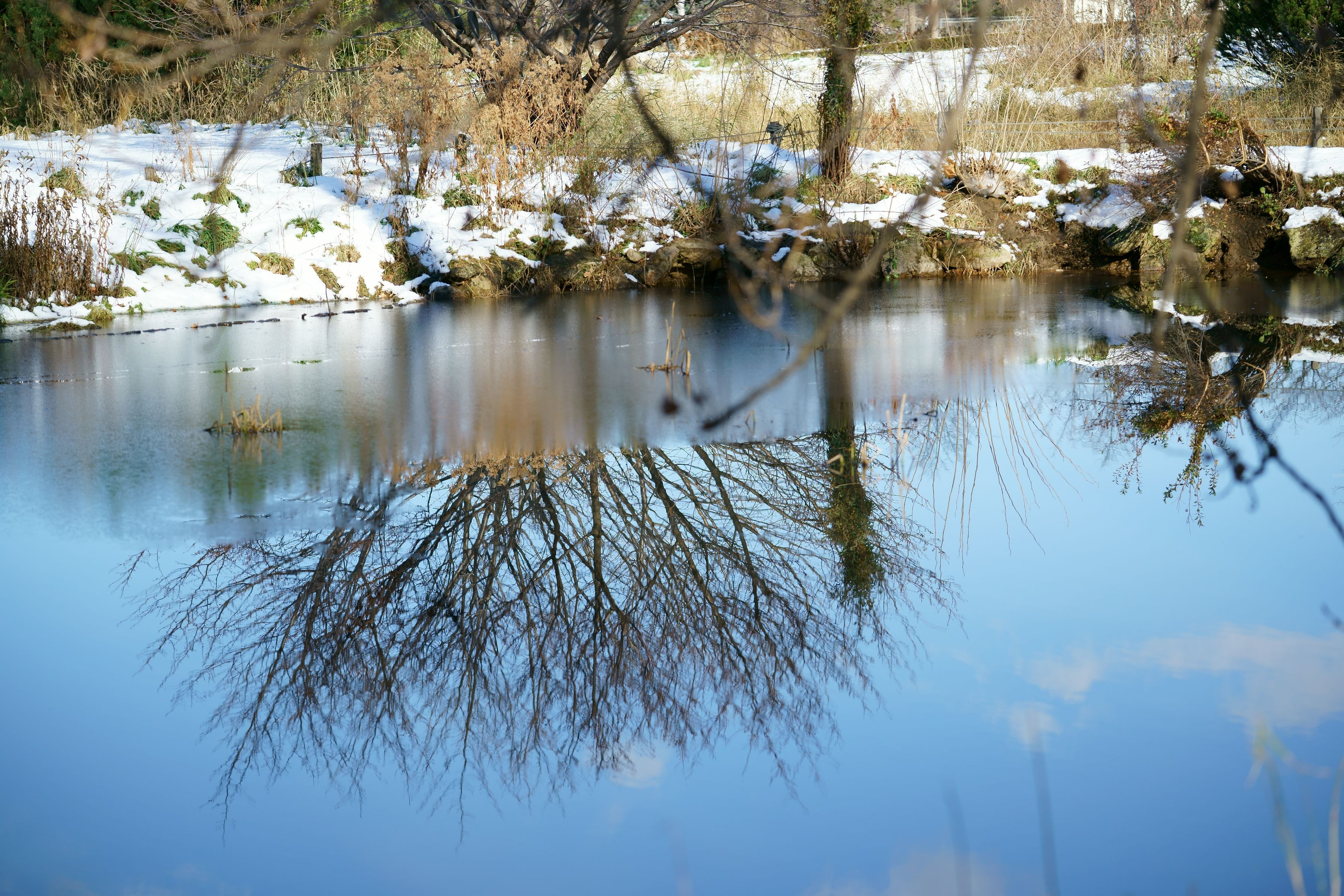 池にも初雪が降り、早く溶けた所だけに 葉の落ちた木々が映っていました。