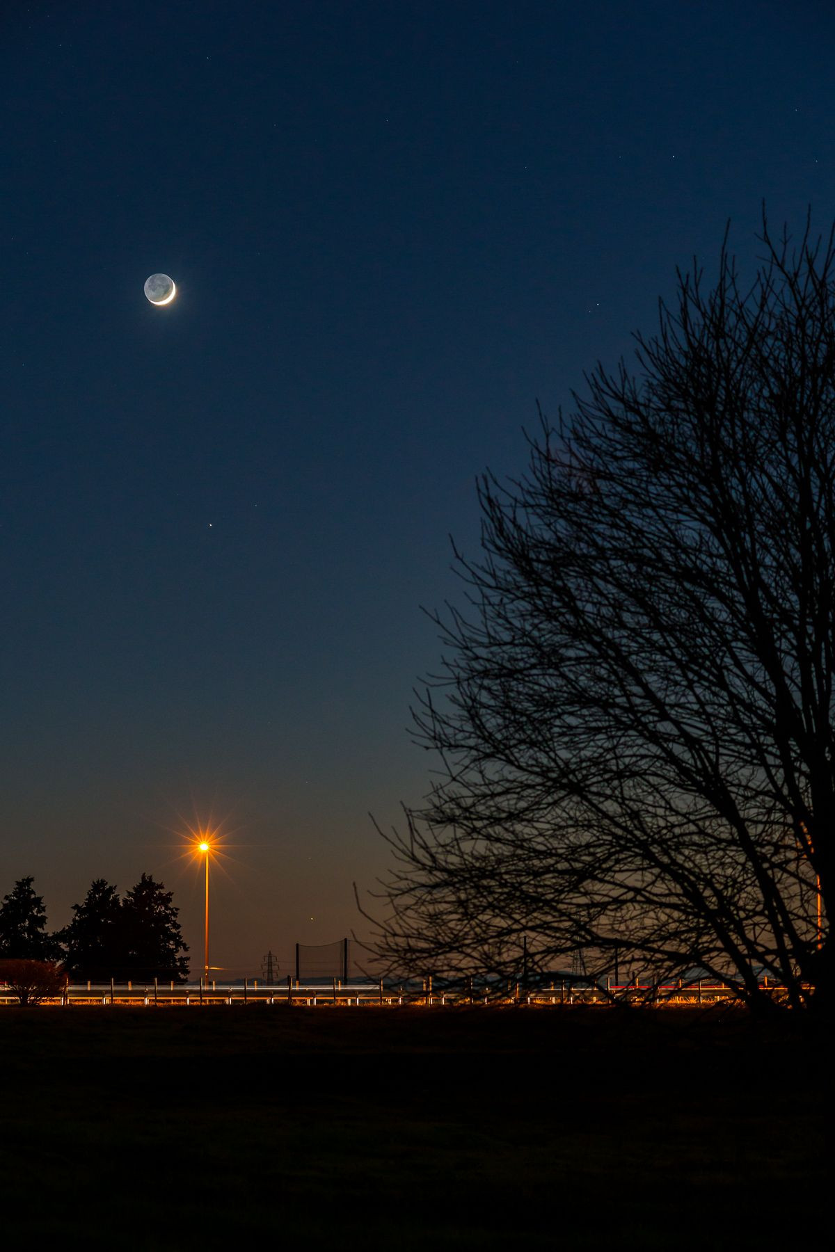 地球照の夕月と土星、地平近くには水星も見えています。 1枚目は富士山と。