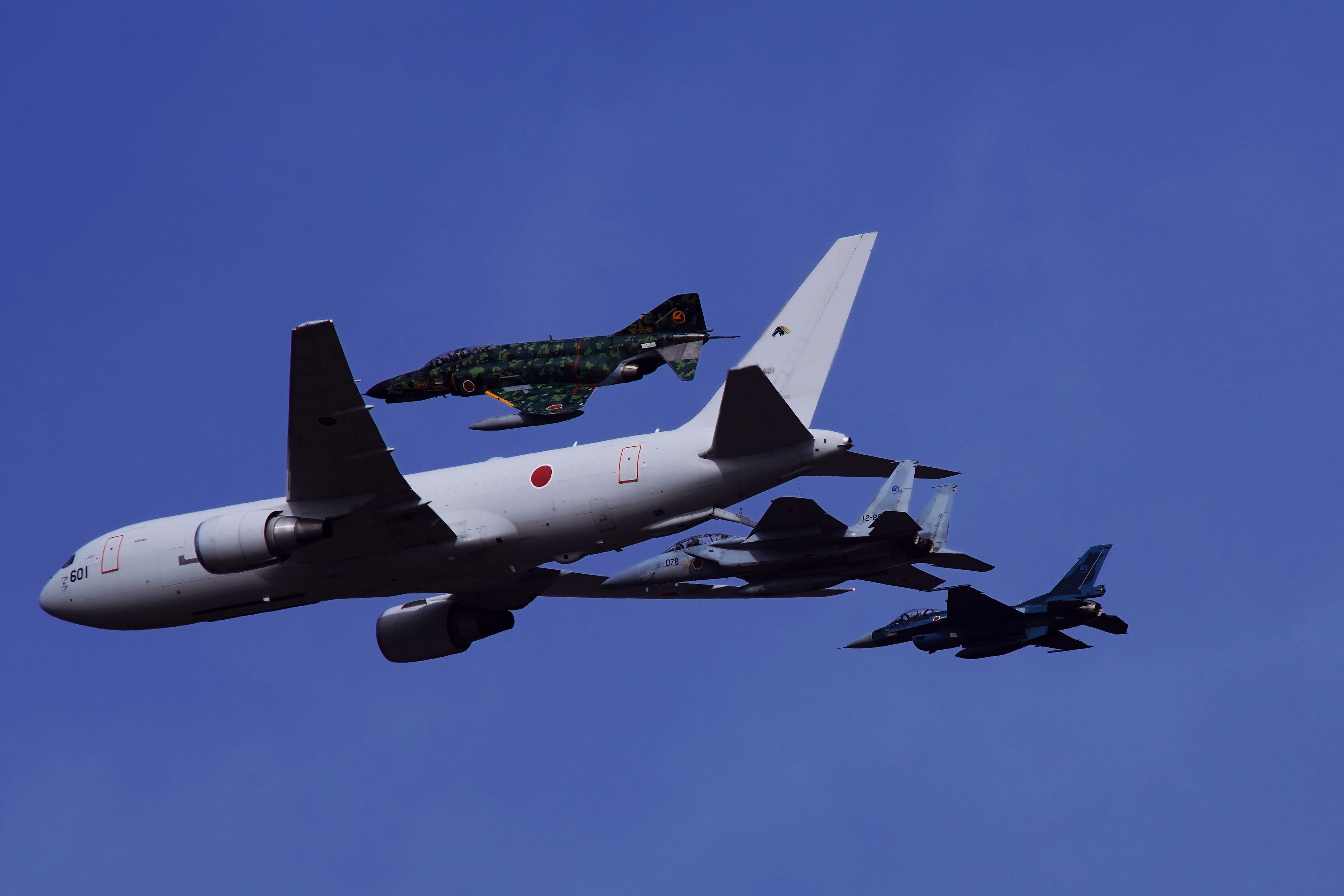 急速に変化する天候に翻弄された岐阜基地航空祭。青空のもと機動飛行の最後にサプライズ。空中給油機KC-767、F4、F2、F15の異機種編隊飛行からのブレイク。