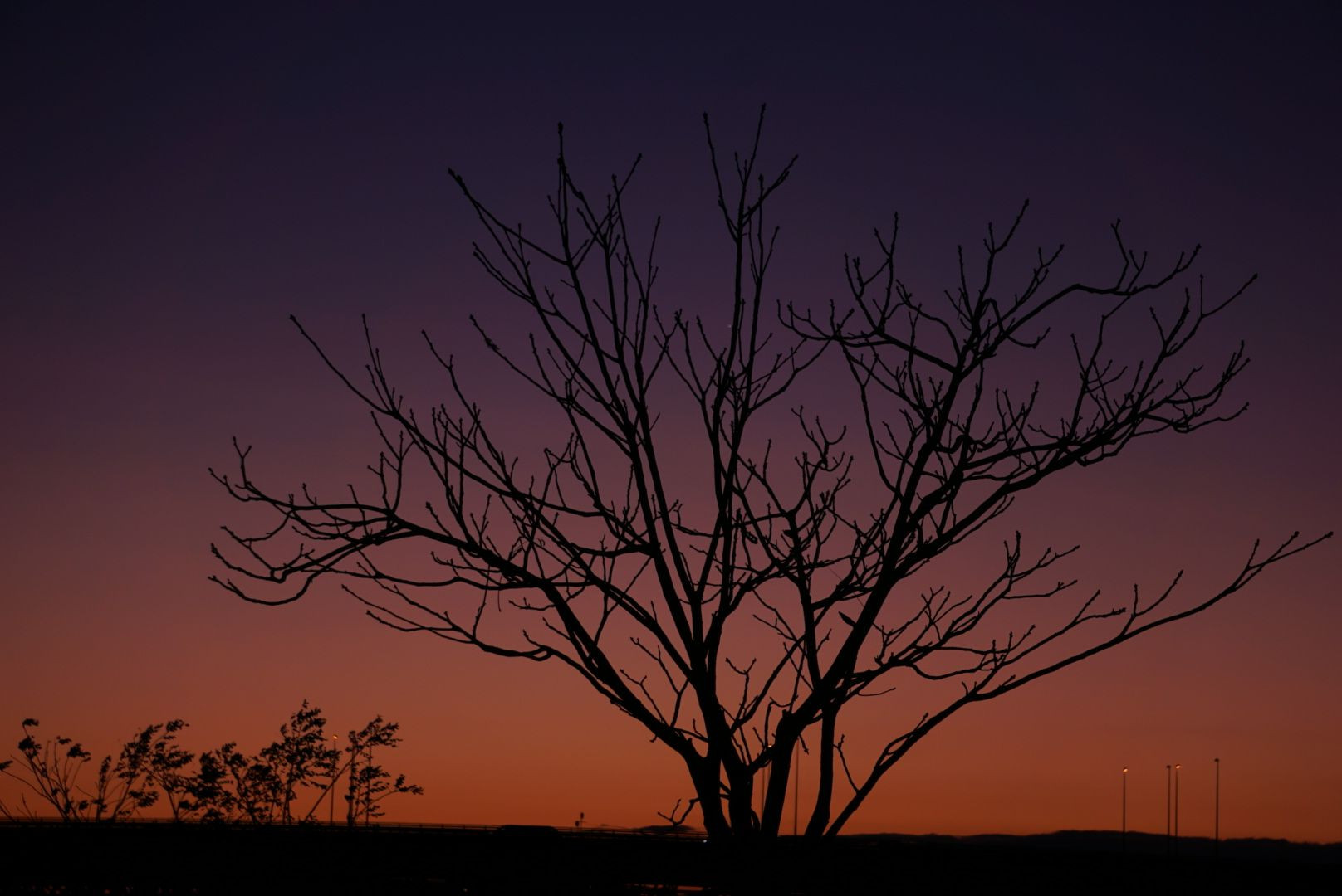 夜明けを迎えた一本の木。