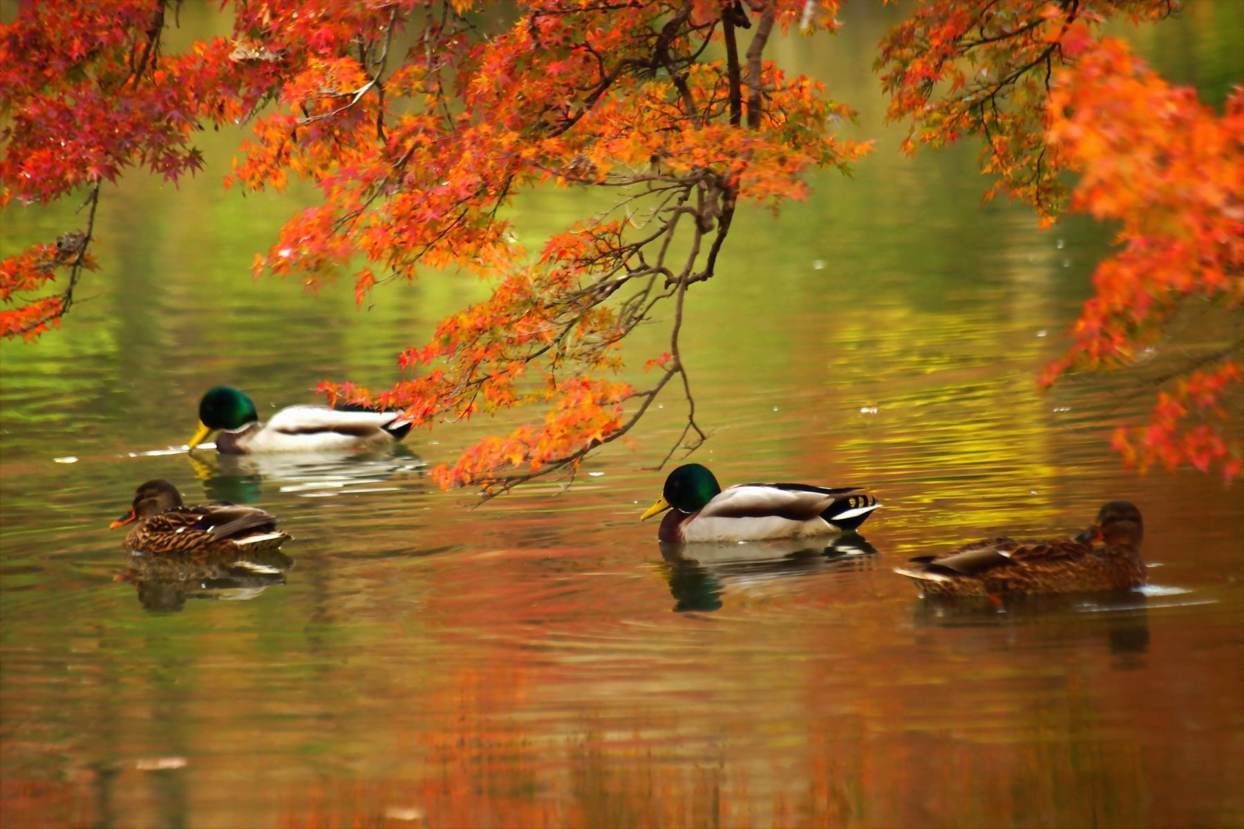 秋の京都府立植物園の池には紅葉の色が水面に写り、池で遊ぶ鴨たちの軌跡が美しい処です、