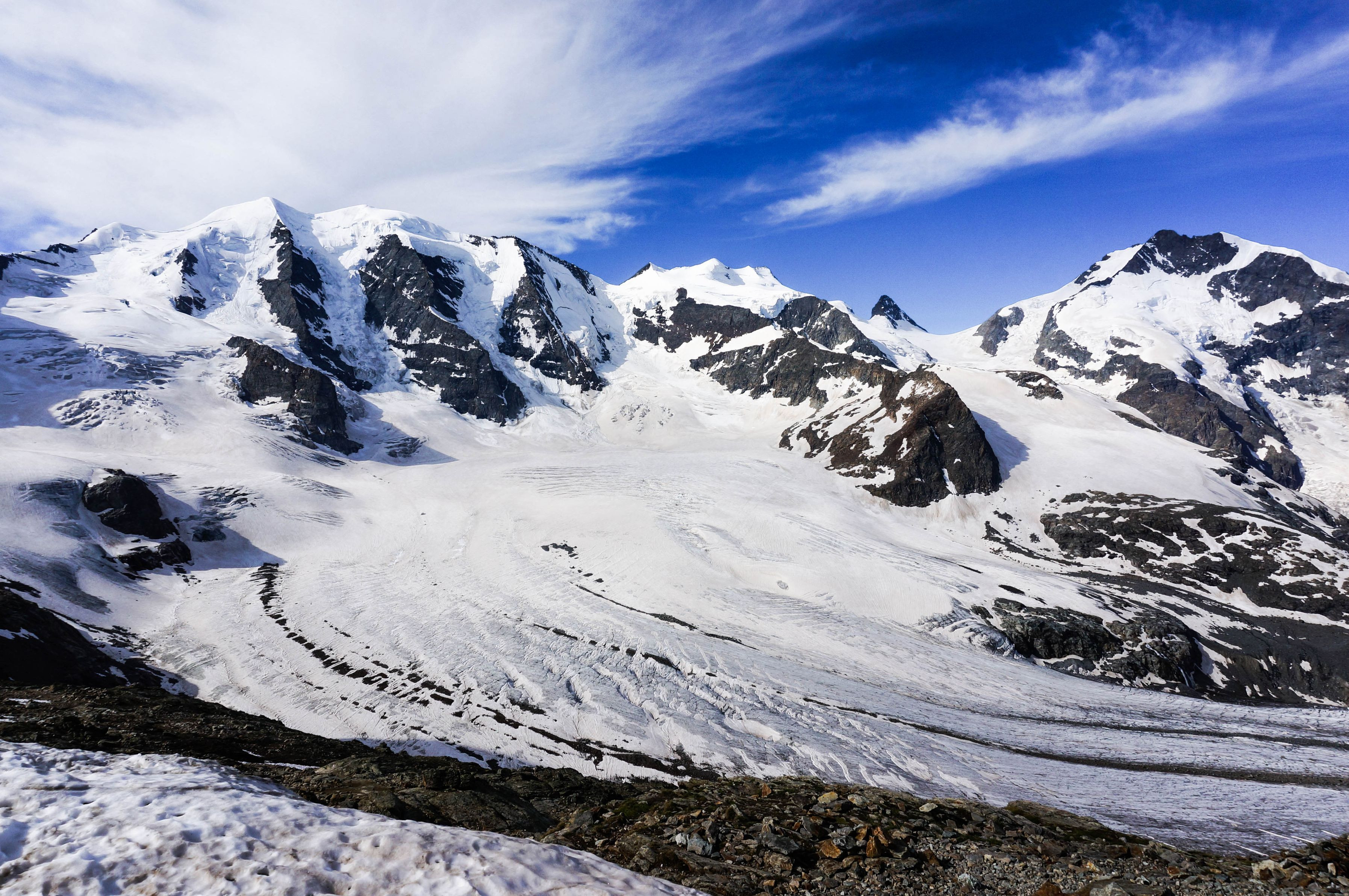 左から、ピッツ・パリュー(3905m)、ベラヴィスタ(3922m)、ベルニナ山群最高峰のピッツ・ベルニナ(4049m)が並んでいます。手前をペルス氷河が流れています。