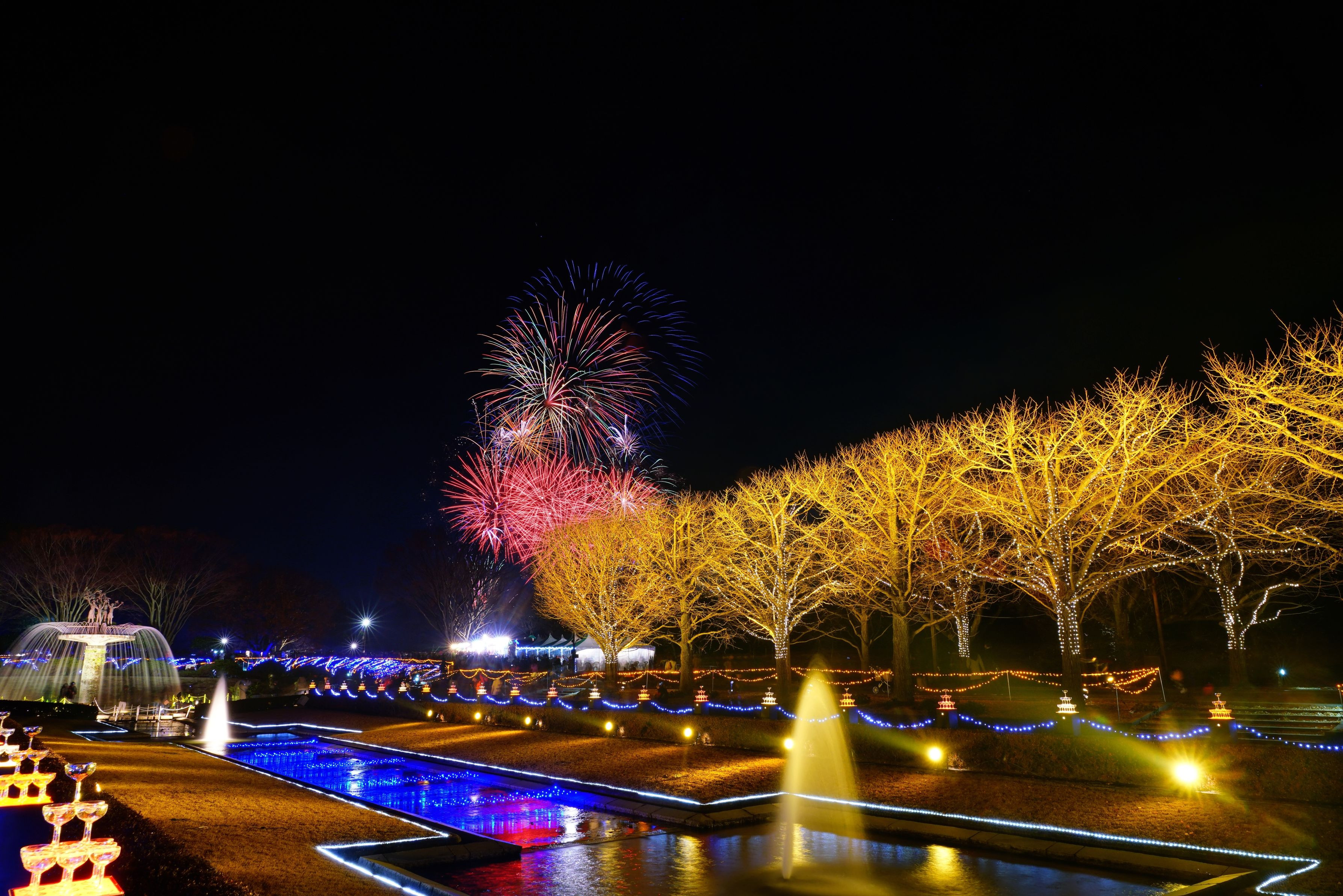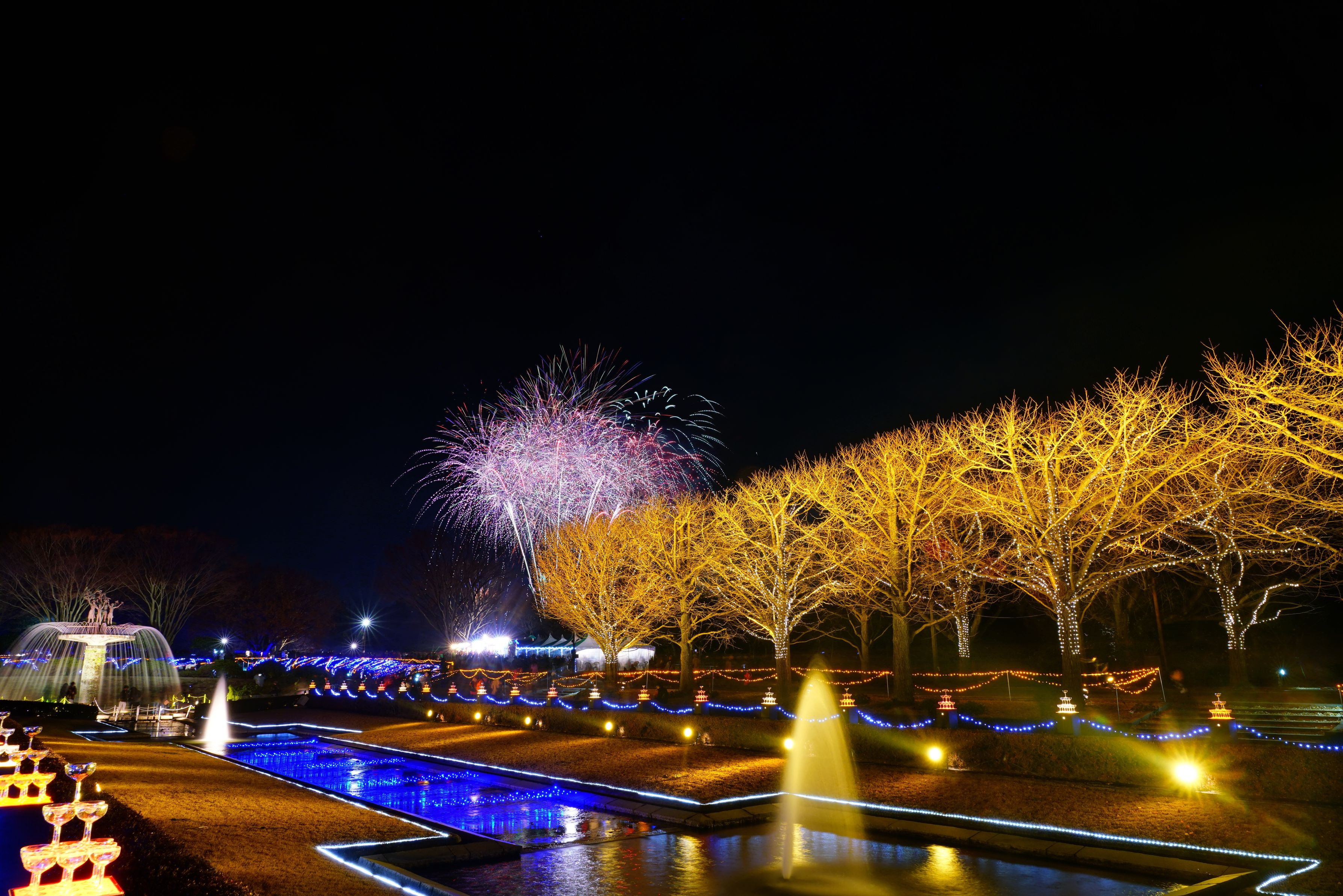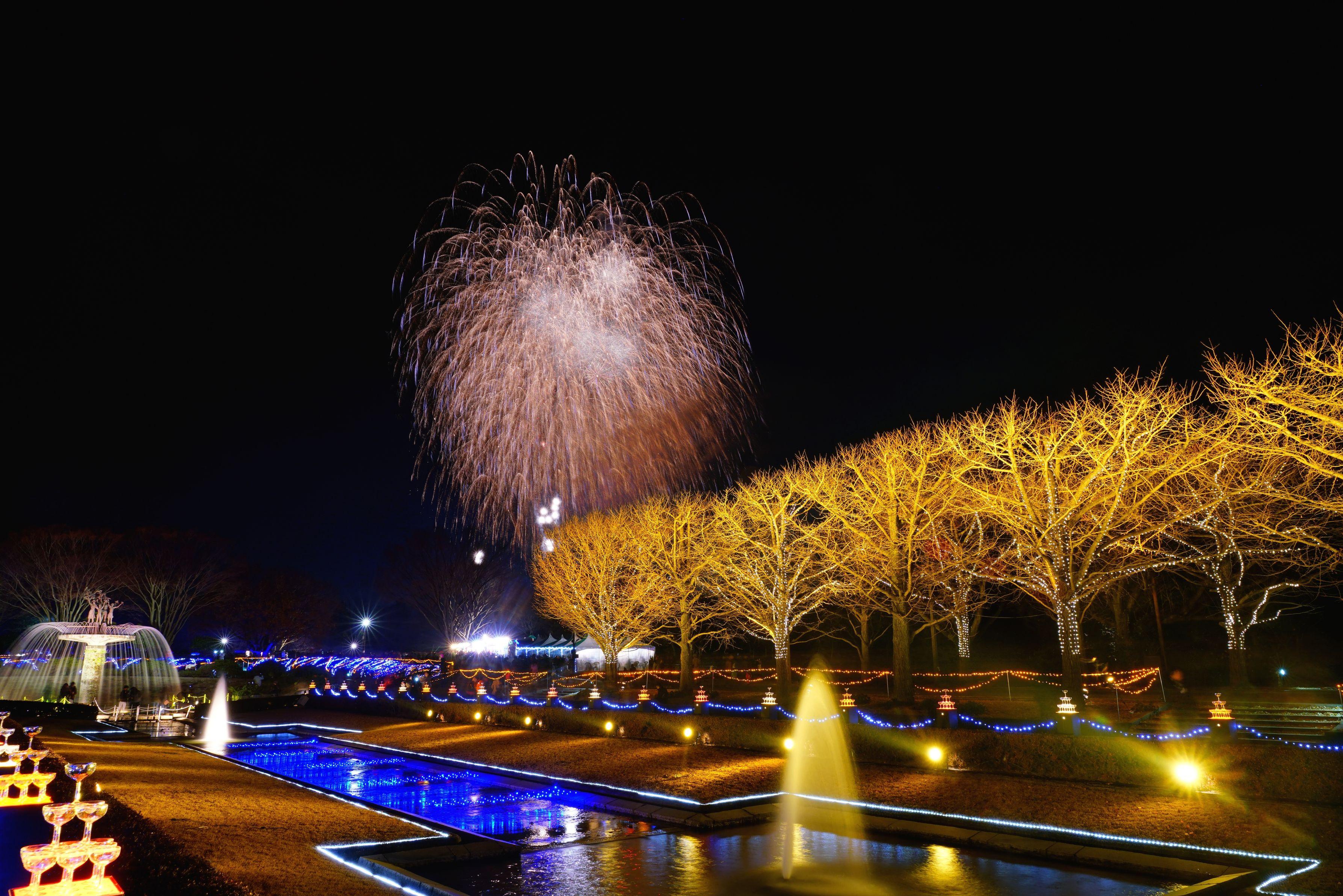 昭和記念公園のイルミネーション花火になります。 比較明合成です。