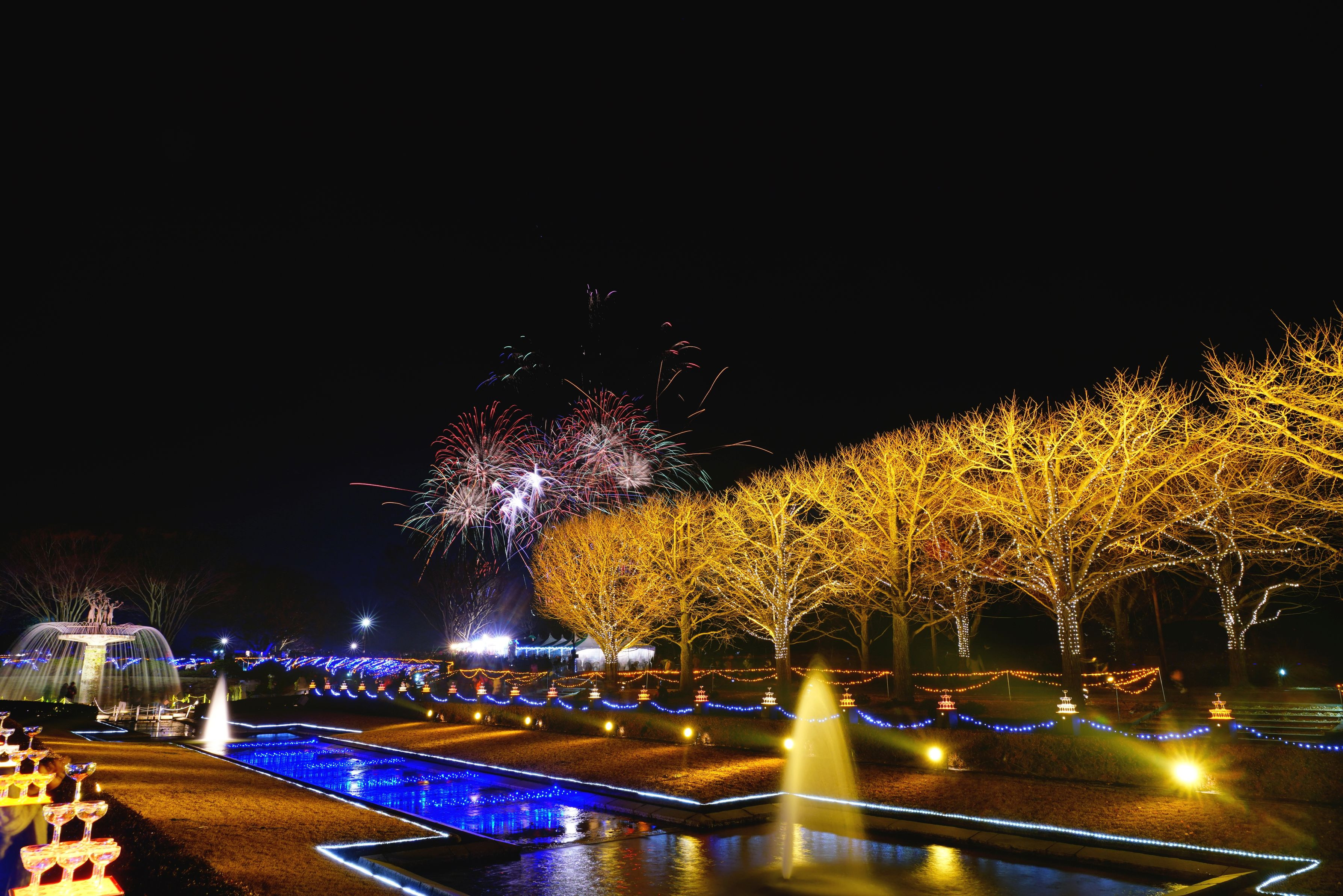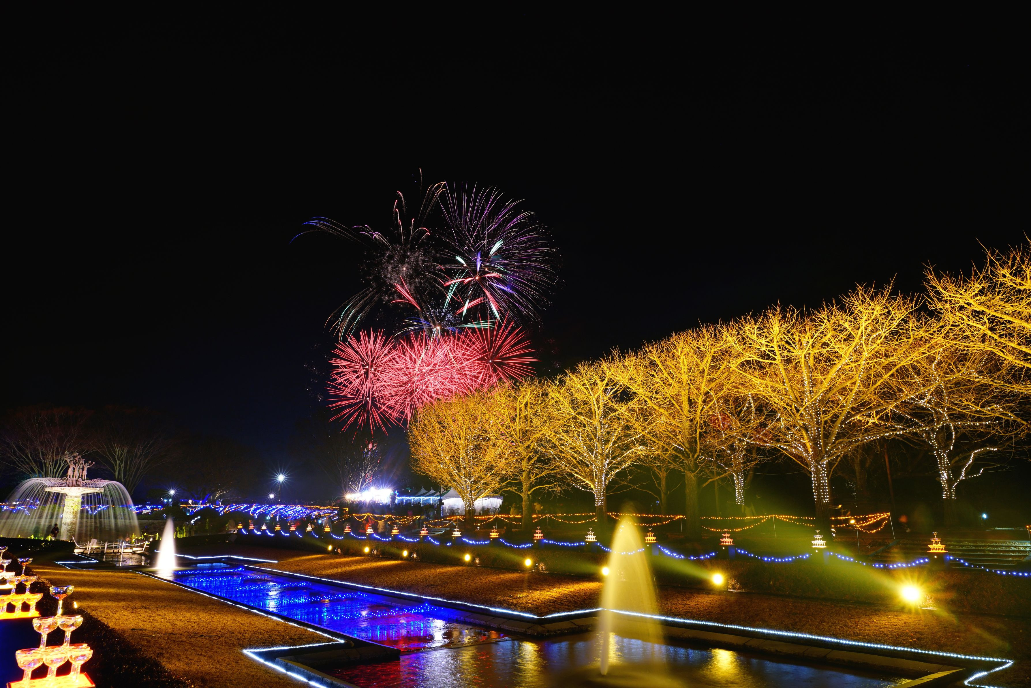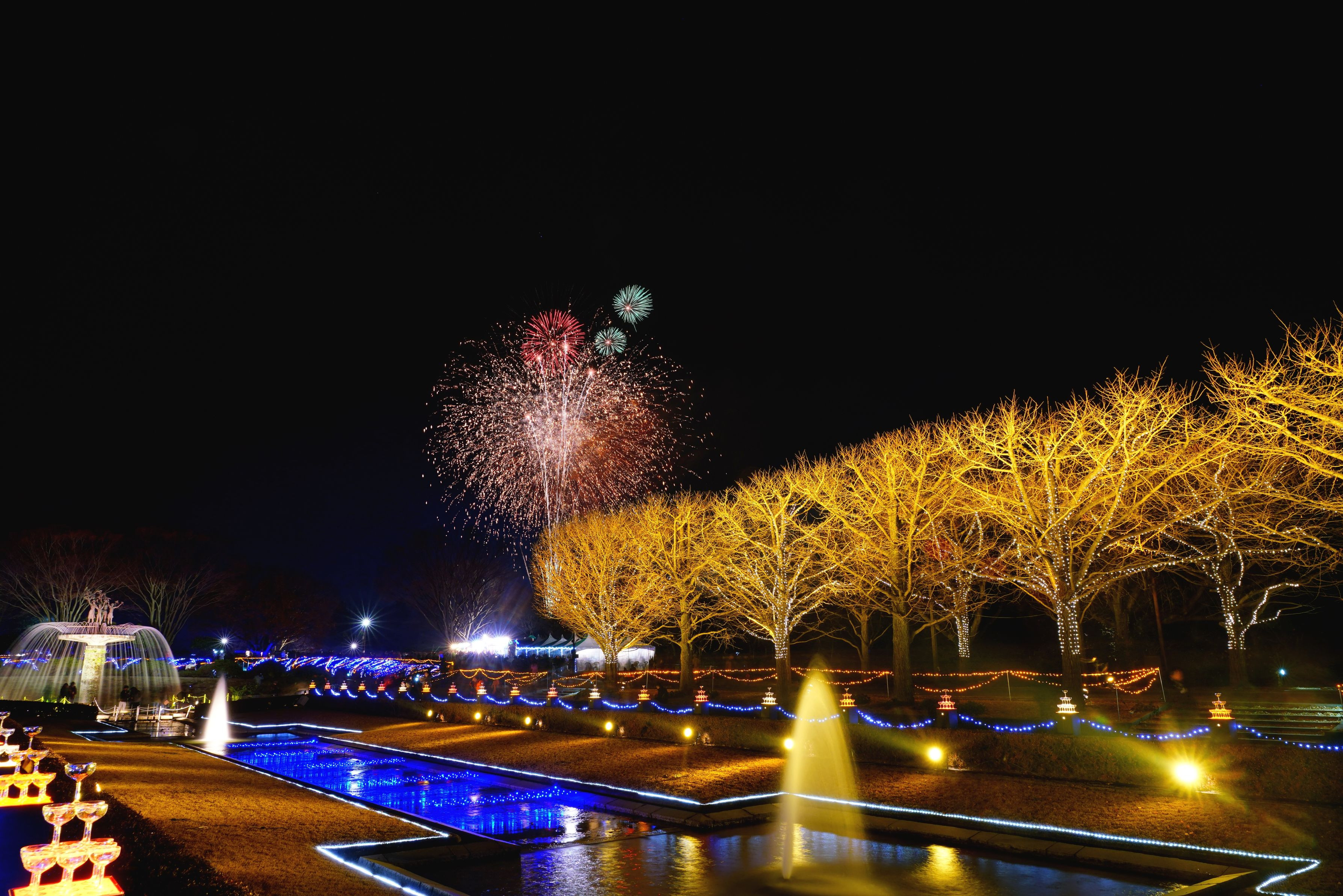 昭和記念公園のイルミネーション花火になります。 比較明合成です。