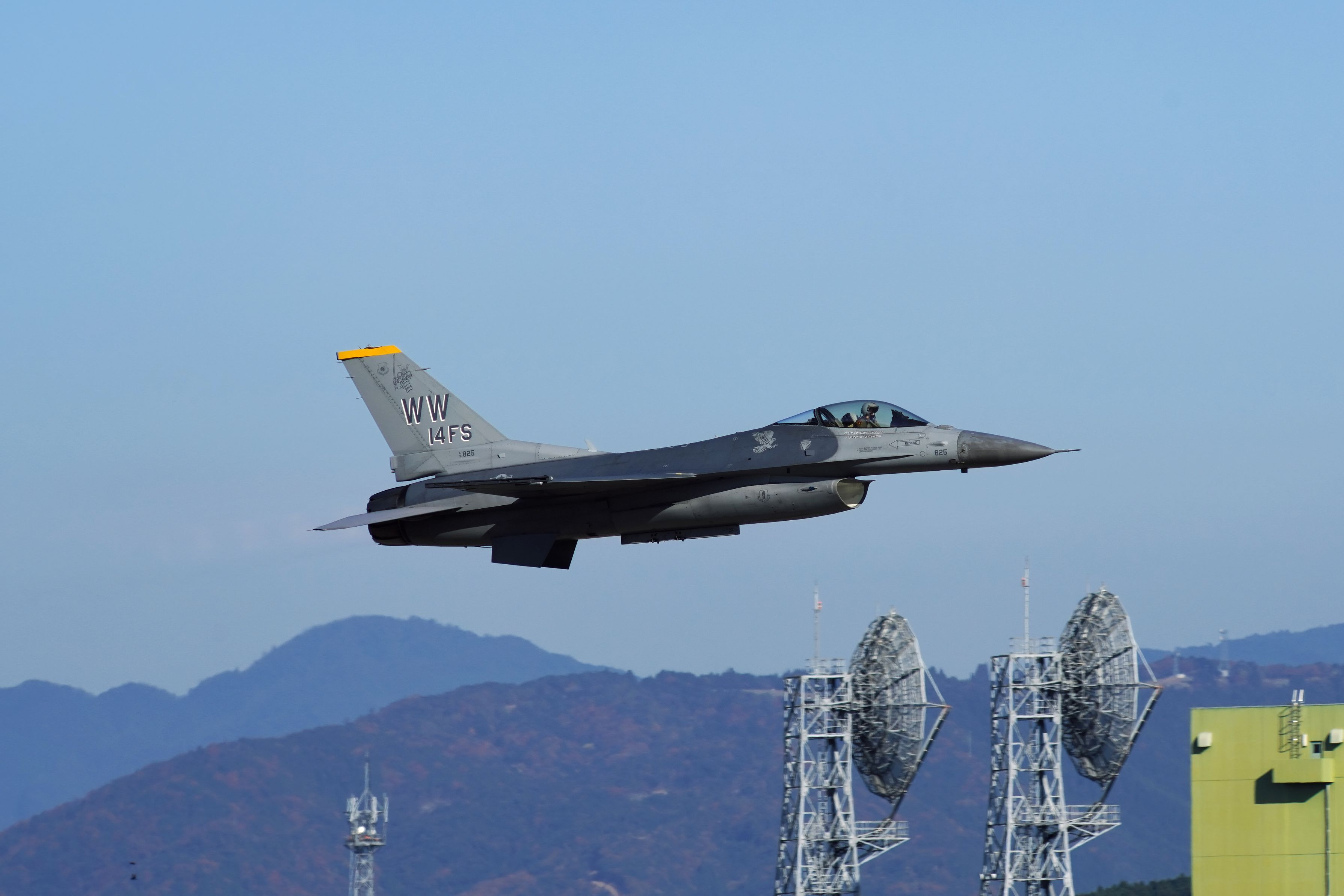 第14戦闘飛行隊隊長指定機がバーナー点火で離陸。この後、ハイレートクライム。快晴なので、高速振り子運動の開始です。ファインダーで追い続けるのが辛い課目です。