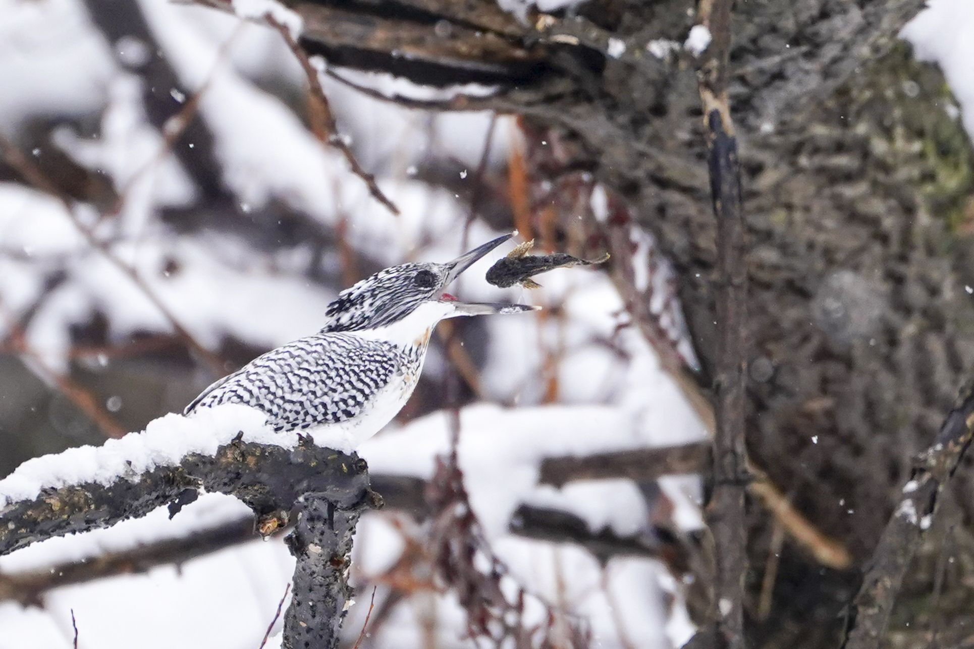 ヤマセミ撮影に出かけて4日目。本日ようやく出会えることが出来ました。 お正月らしく「ご縁起・曲芸食・離れ業」でございます(^^♪。 今年もどうぞよろしくお願いします。