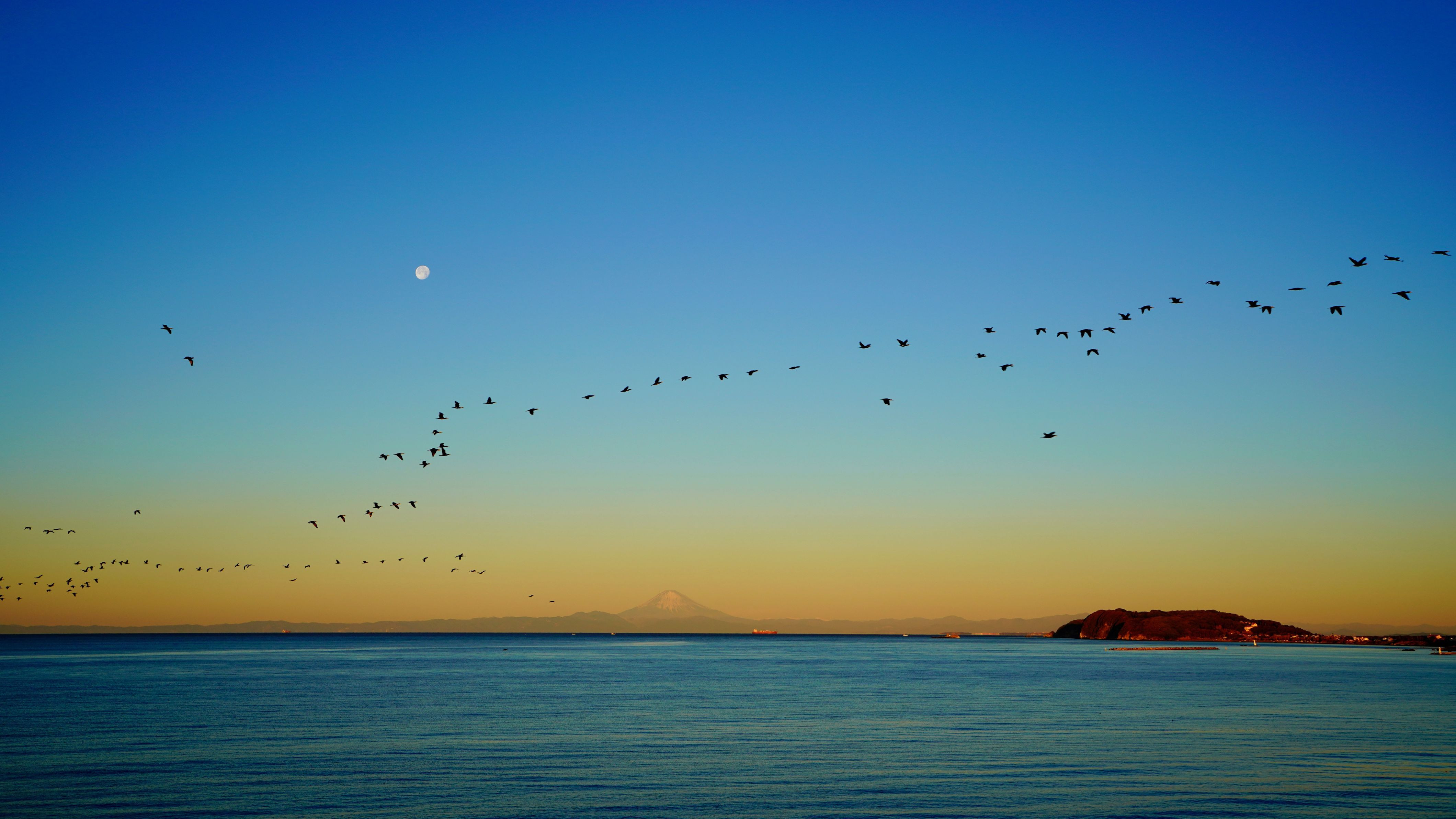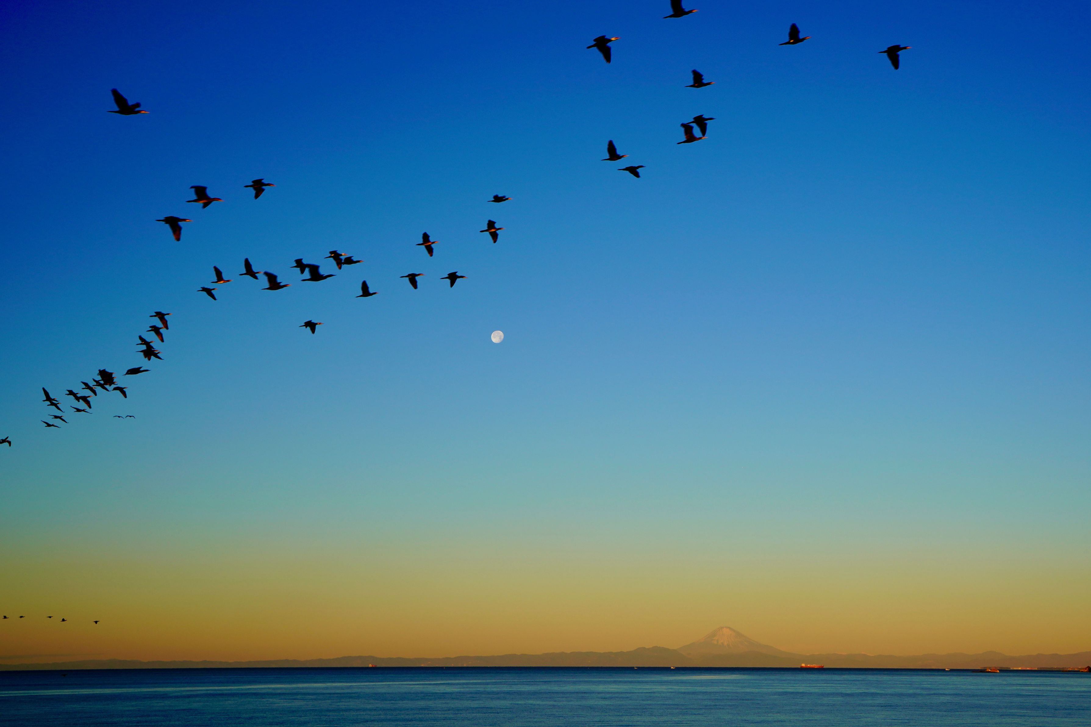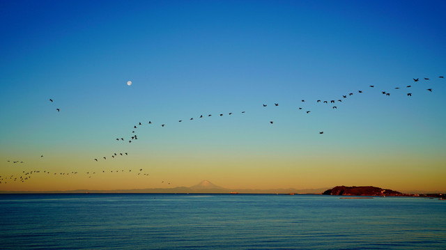 製品情報>My Sony>αcafe>お月さまのある朝焼け空をを渡り鳥が飛ぶ・・(ひだまりにゃんさん)
